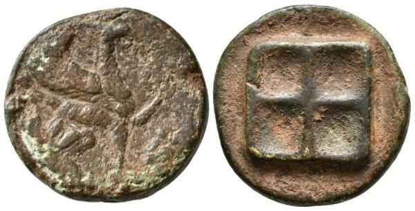 THRACIA, Abdera. ¿Tessera?. Siglo V-IV a.C. A/ Grifo a derecha, delante estrella. R/ Cuadripartito en relieve. Ae. 7,28g. MBC-/MBC+. Rara.