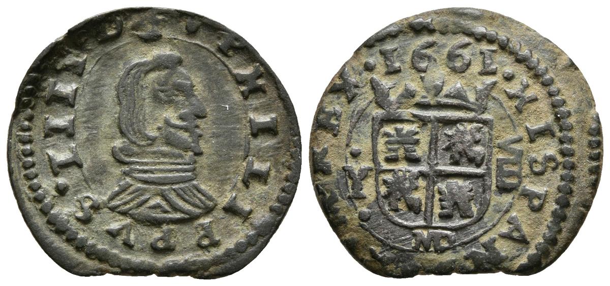 FELIPE IV. 8 Maravedís. 1661. Madrid Y. Orla lineal en anverso y reverso. Cal-1420; J.S. M-300 var. Ae. 2,35g. MBC+. Rara.
