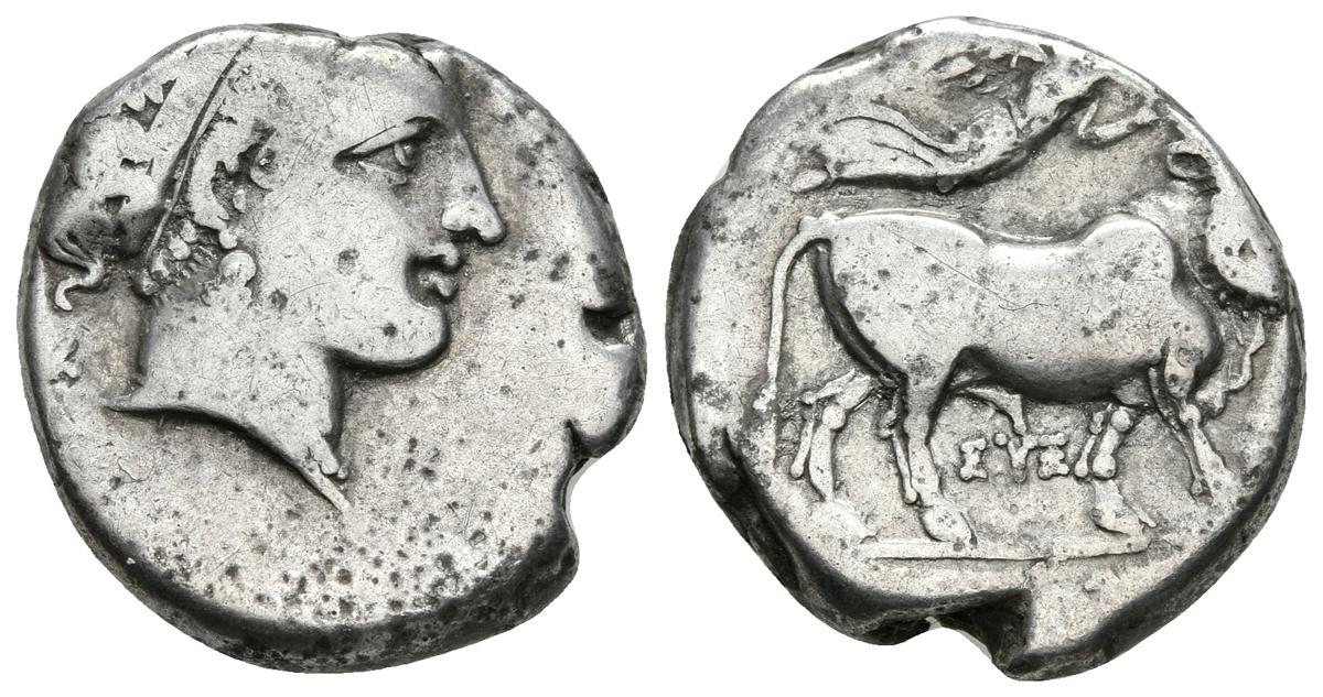CAMPANIA. Neapolis. Didracma. 300-275 a.C. A/ Cabeza de Ninfa a derecha. R/ Toro con cabeza de hombre caminando a derecha, Nike sobre él coronándolo, entre las patas EYE. HN Italy 579var. Ar. 7,15g. MBC.