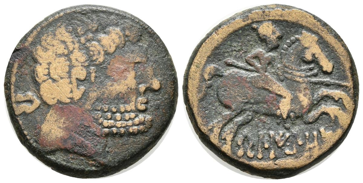 BELIGIOM. As. 120-20 a.C. Belchite (Zaragoza). A/ Cabeza barbada a derecha, detrás letra ibérica Be. R/ Jinete con lanza a derecha, debajo BeLIGiOM. FAB-243. Ae. 9,47g. BC+/MBC-.