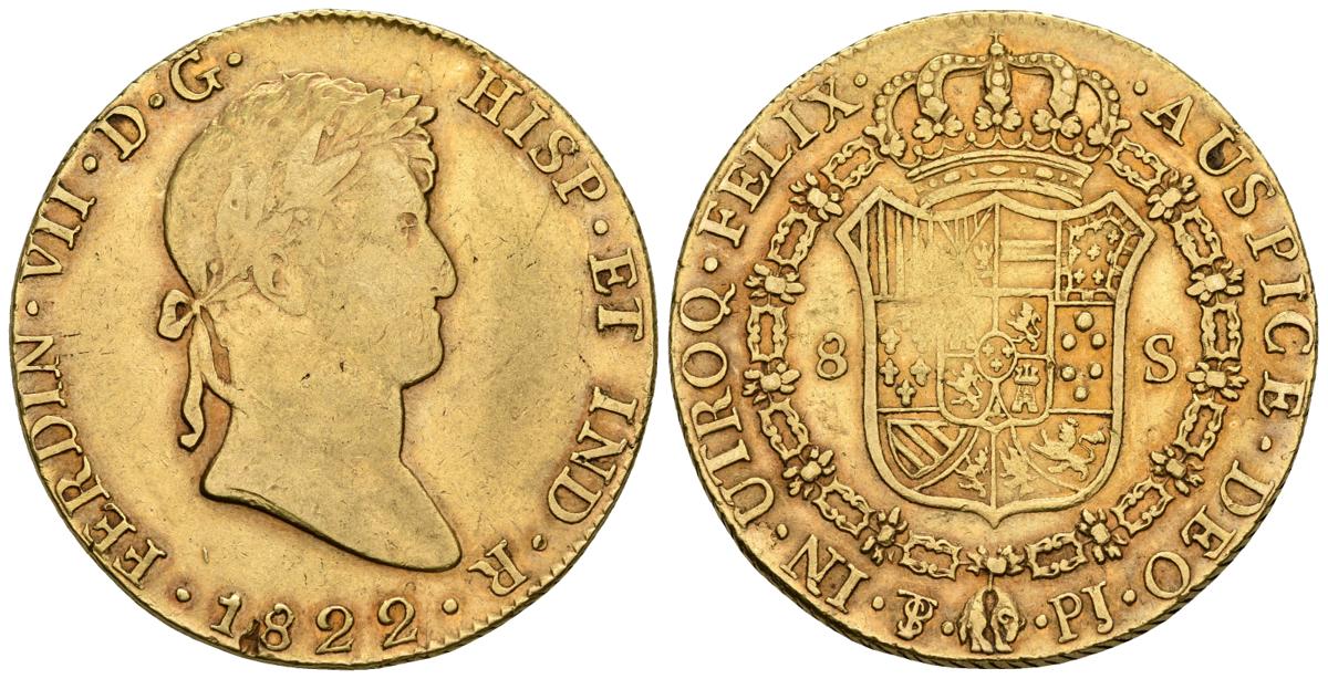 FERNANDO VII. 8 Escudos. 1822. Potosí PJ. Cal-88; Cal. Onza 1306. Au. 26,99g. Bonito color y hojita junto a la fecha. MBC+. Muy escasa.