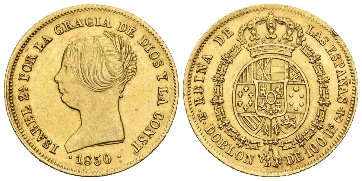 ISABEL II. Doblón de 100 Reales. 1850. Madrid CL. Cal-3. Au. 8,19g. Conserva parte del brillo original. Golpecito en el canto. MBC+/EBC-. Escasa.
