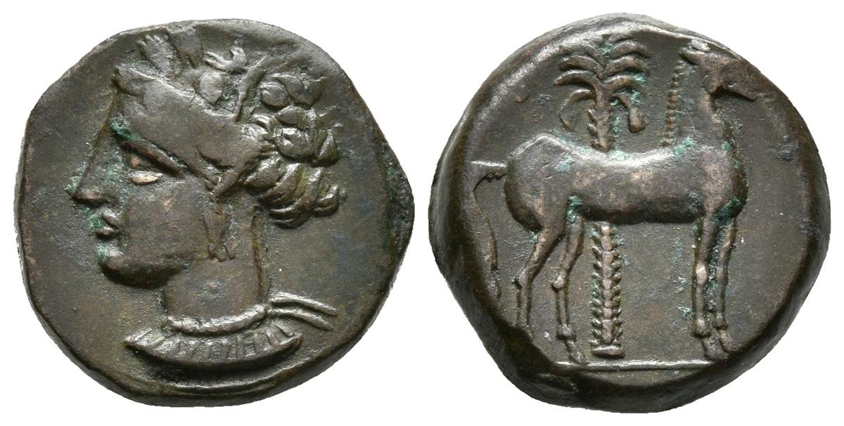 CARTAGONOVA. 1/2 Calco. 220-215 a.C. Cartagena (Murcia). A/ Cabeza de Tanit a izquierda. R/ Caballo a derecha, detrás palmera. FAB-507. Ae. 2,90g. EBC-.