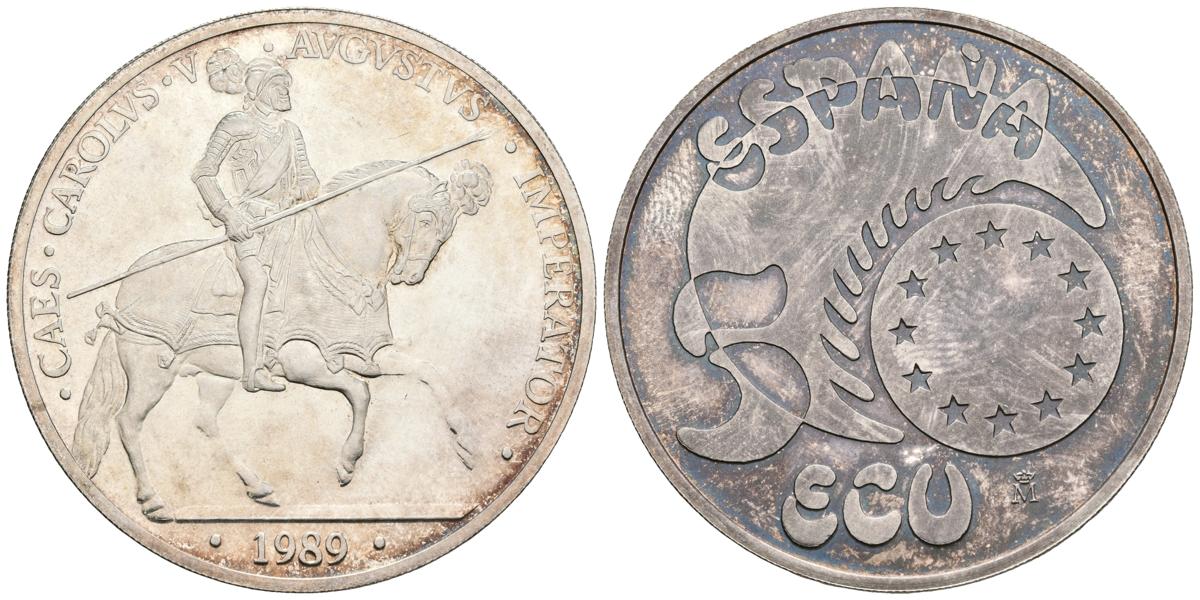 JUAN CARLOS I. 5 Ecu. Carlos V. Presentado en estuche oficial de FNMT. Ar. 33,69g. Tono. SC-.