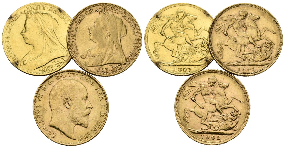 AUSTRALIA. Sovereign. 1893, 1897 (estuvo en aro) y 1902. Au. Peso total del conjunto 23,98g. BC+/MBC. A EXAMINAR.