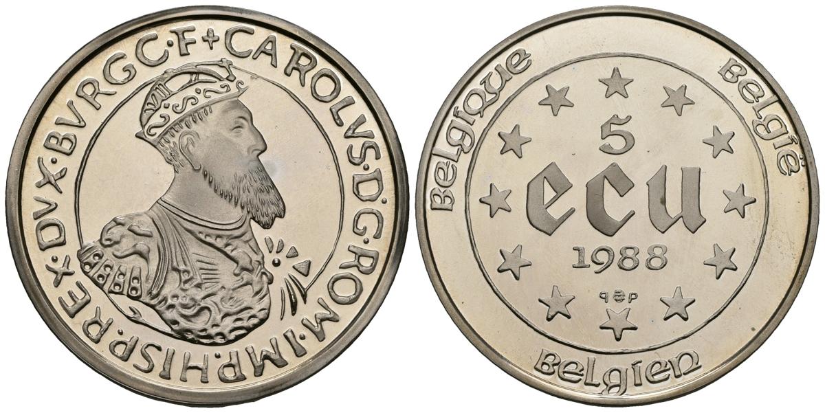 BELGICA. 5 Ecu. 1988. Carlos V. Km#166.2. Ar. 22,96g. PROOF.