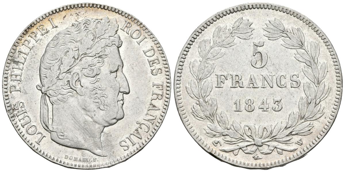 FRANCIA. Louis Felipe I. 5 Francs. 1843. Lille K. Km#749.13. Ar. 24,83g. Rayitas en anverso. MBC.