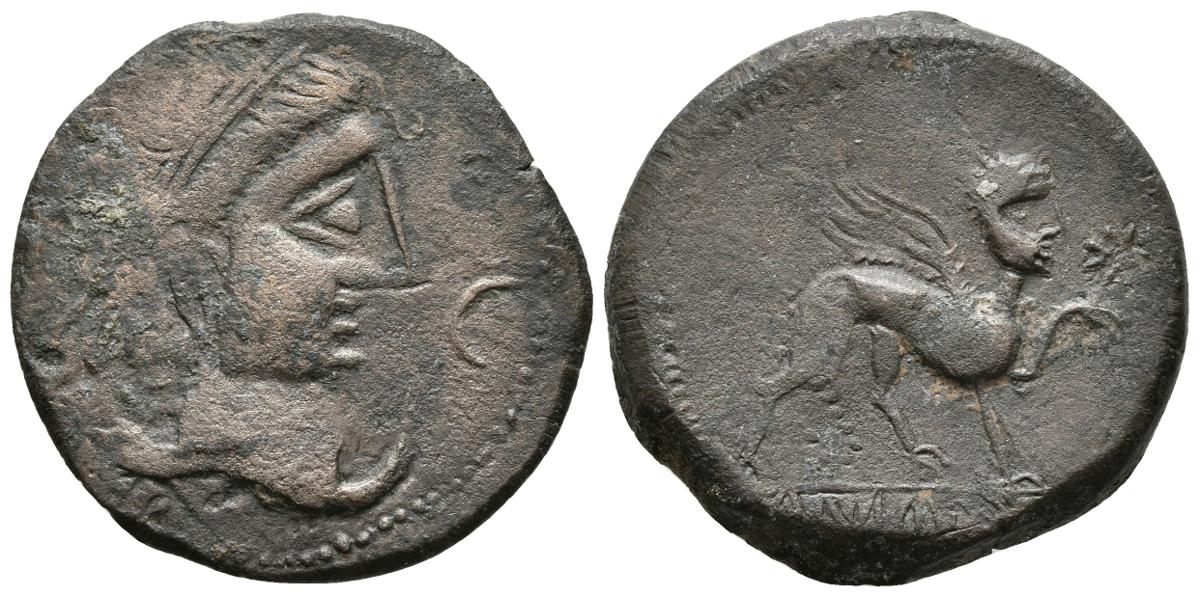 CASTULO. As. 180 a.C. Cazlona (Jaén) A/ Cabeza masculina diademada a derecha delante creciente. R/ Esfinge avanzando a derecha, debajo KaSTiLO. Delante estrella. FAB-702. Ae. 9,99g. MBC-.