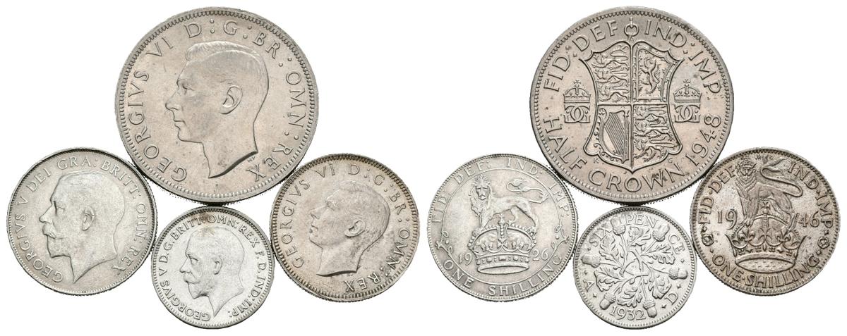 GRAN BRETAÑA. Lote compuesto por 4 monedas. Conteniendo: 6 Pence 1932; 1 Shilling 1926; 1 Shilling 1946 y 1/2 Crown 1948. Ar-Cu/Ni. A EXAMINAR.
