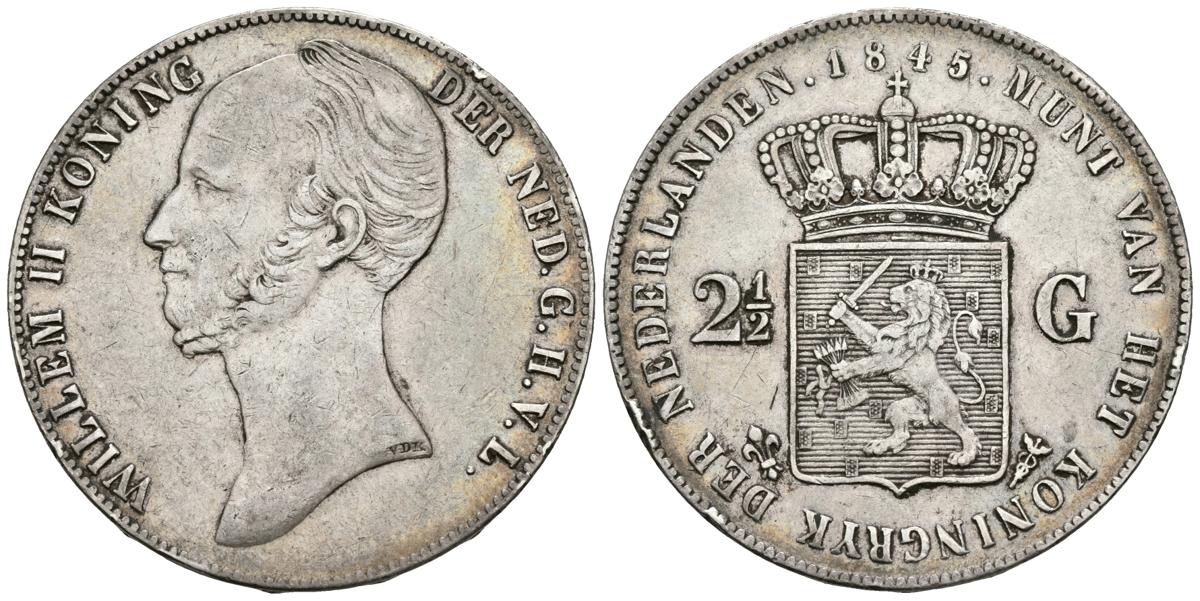 PAISES BAJOS. Willem II. 2½ Gulden. 1845. Km#69. Ar. 24,89g. Golpecitos en el canto. MBC.
