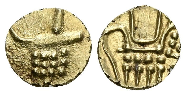 INDIA HOLANDESA. Fanam. (1675-1724). Cochin. A/ Figura estilizada de la deidad Kali. R / J horizontal con cuatro líneas de puntos. Cf. Friedberg 1504; Km#23; Fr-1400. Au. 0,41g. EBC.