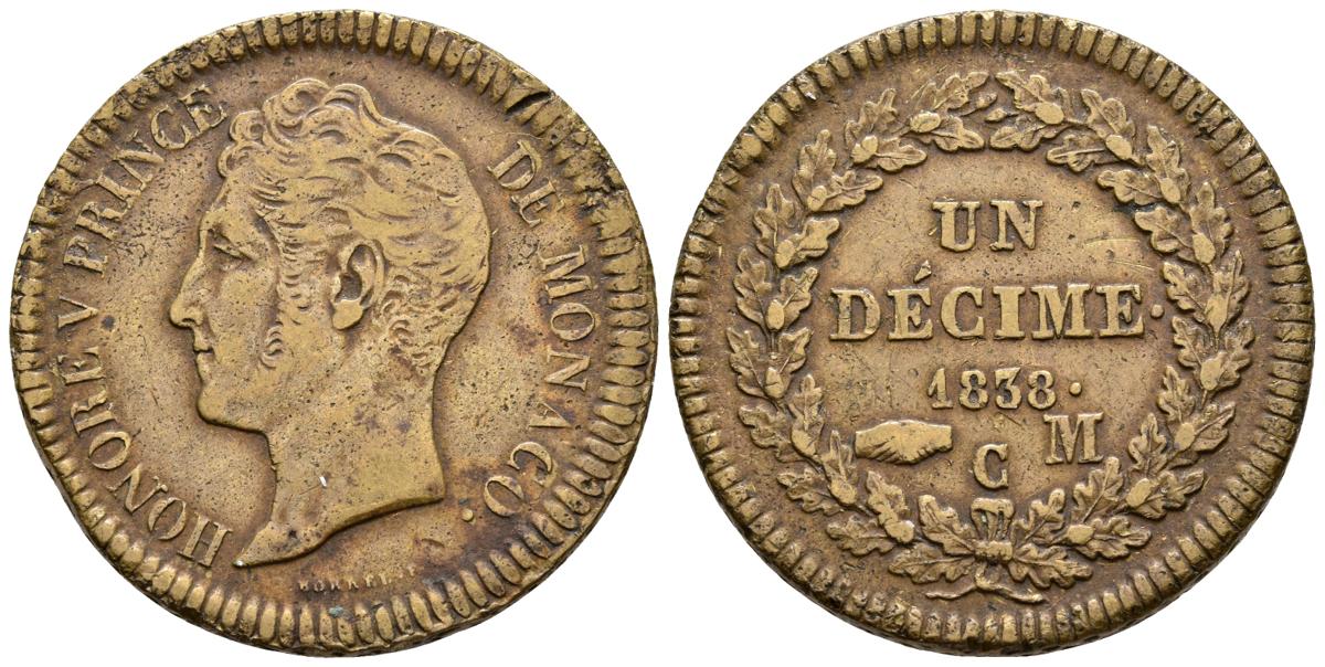 MONACO. Honore V. 1 Décime. 1838. Monaco C. Km#97.1. Ae. 17,80g. MBC-.