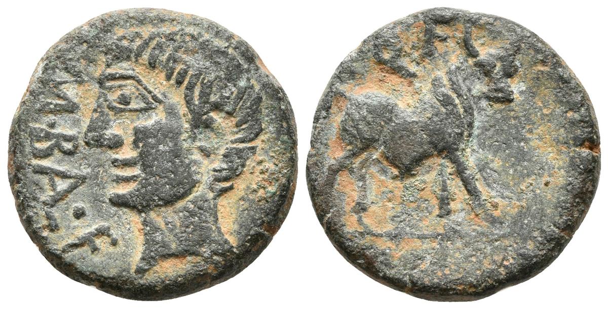 CASTULO. Semis. 180 a.C. Cazlona (Jaén) A/ Cabeza masculina a izquierda, delante M. BAL. F. R/ Toro a derecha, encima M. Q. F. FAB-748. Ae. 5,85g. MBC+/MBC.