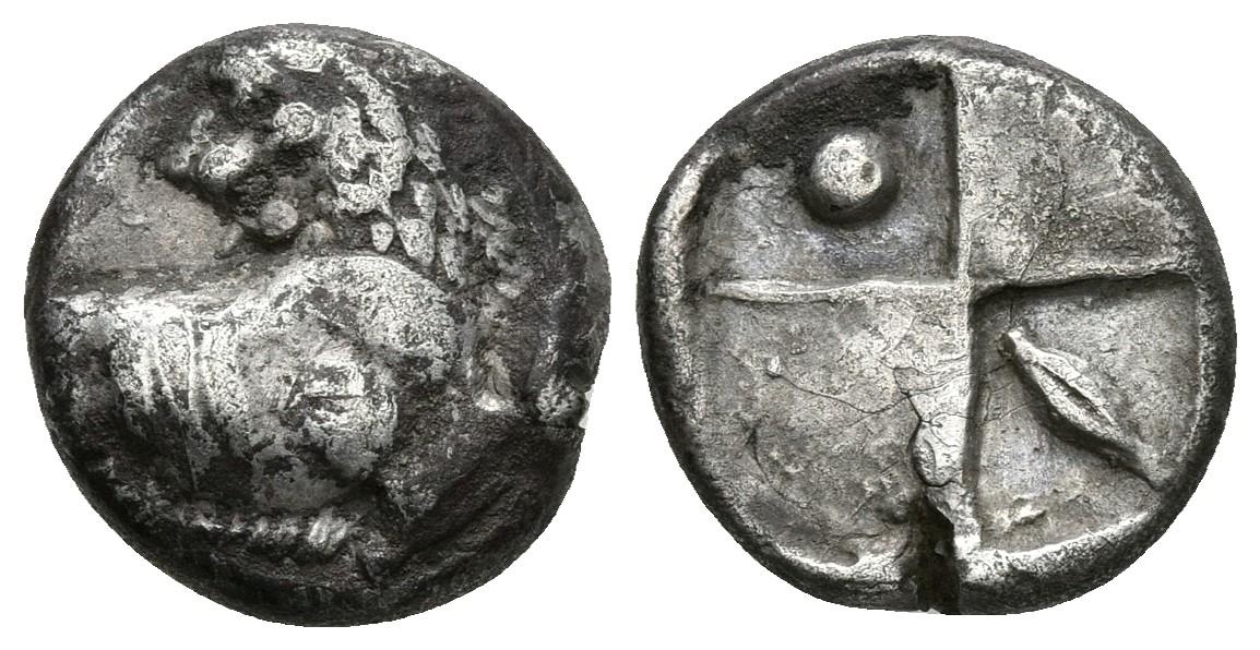 CHERSONESOS, Tracia. Hemidracma. 386-338 a.C. A/ Parte delantera de león a izquierda con cabeza vuelta. R/ Cuatro cuadros incusos, primer cuartel grano de trigo y tercer cuartel punto. SNG Manchester 776. Ar. 1,80g. MBC.