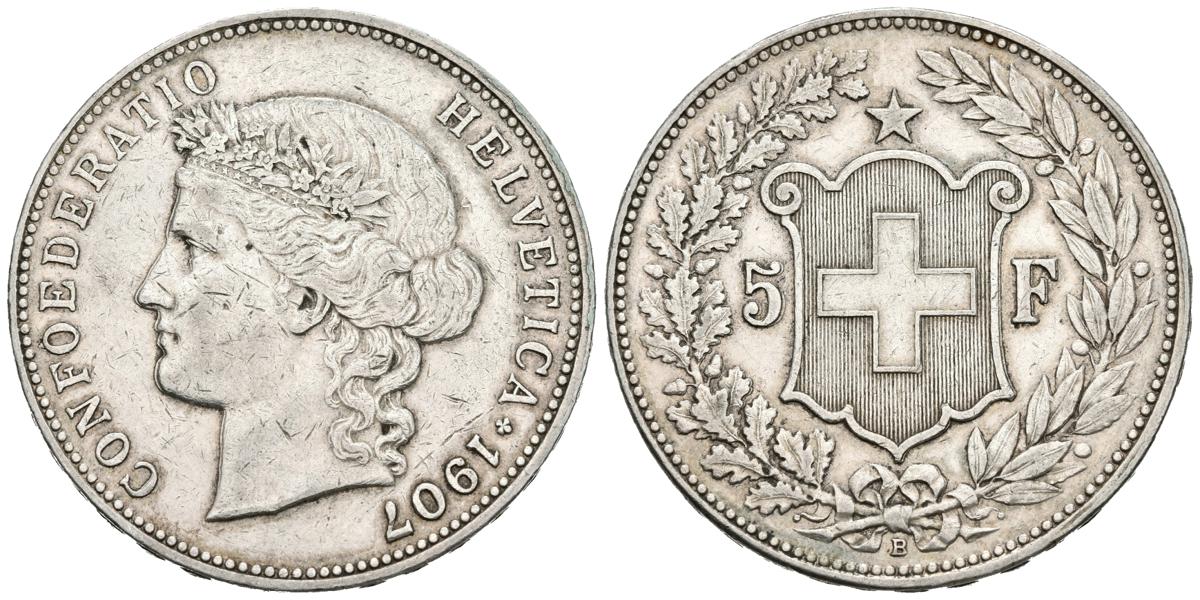 SUIZA. 5 Francs. 1907. Berna B. Km#34. Ar. 25,01g. Golpecitos. MBC/MBC+.