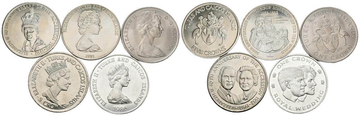 TURKS Y CAICOS. Lote compuesto por 5 monedas. Conteniendo: 5 Crown 1991. Colón ante los reyes; 5 Crown 1992. 40 años de la coronación (2); 1 Crown 1969 y 1 Crown 1986. Boda real. Cu/Ni-Ar. EBC/PROOF. A EXAMINAR.