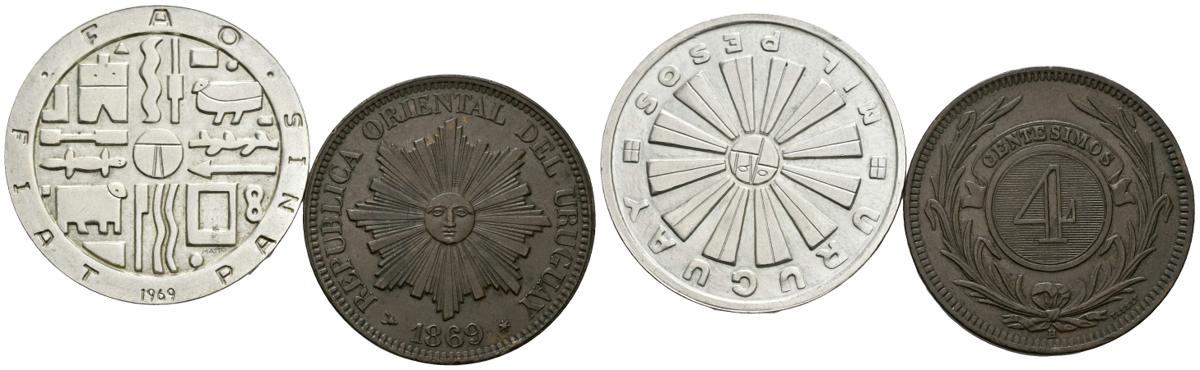 URUGUAY. 4 Centésimos 1869 H y 10000 Pesos 1969 FAO. Km#13 y Km#55. Ae/Ar. MBC+.