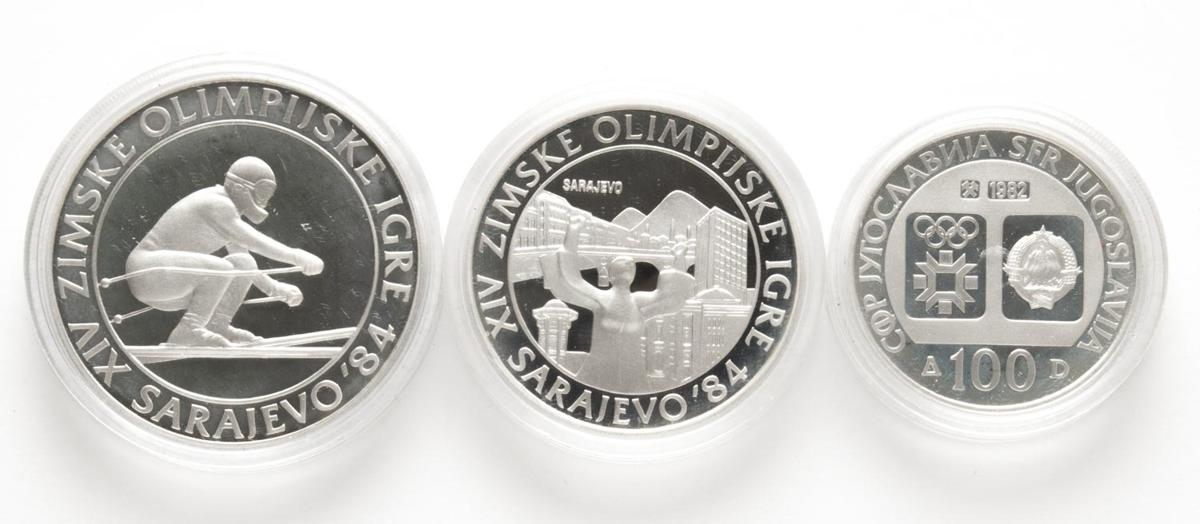 YUGOSLAVIA. Estuche conmemorativo de las olimpiadas de Sarajevo 1984, 500, 250 y 100 Dinara emitidos en 1982. Ar. SC. A EXAMINAR.
