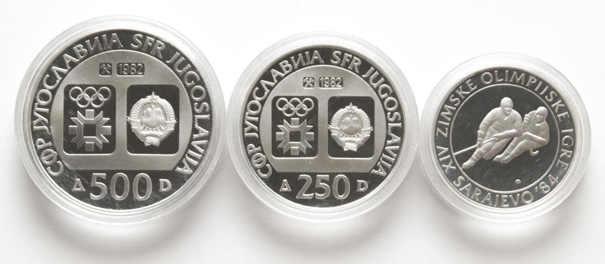 YUGOSLAVIA. Estuche conmemorativo de las olimpiadas de Sarajevo 1984, 500, 250 y 100 Dinara emitidos en 1982. Ar. SC. A EXAMINAR.