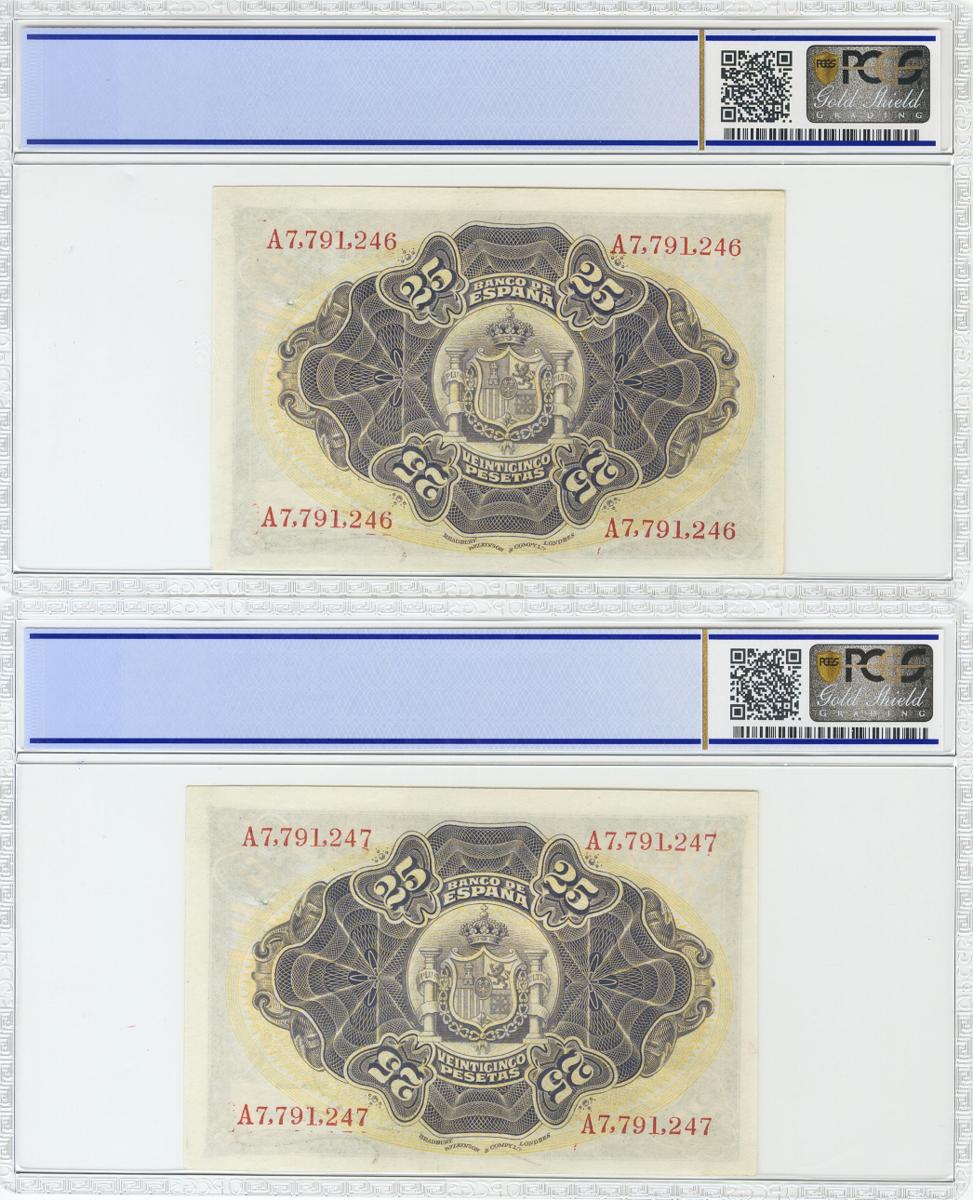 25 Pesetas. 24 de Septiembre de 1906. Pareja correlativa. Serie A. (Edifil 2017: 314a). Dos agujeros similares a los provocados por una grapa pero mucho más distanciados. EBC. Encapsulados PCGS62, ambos.