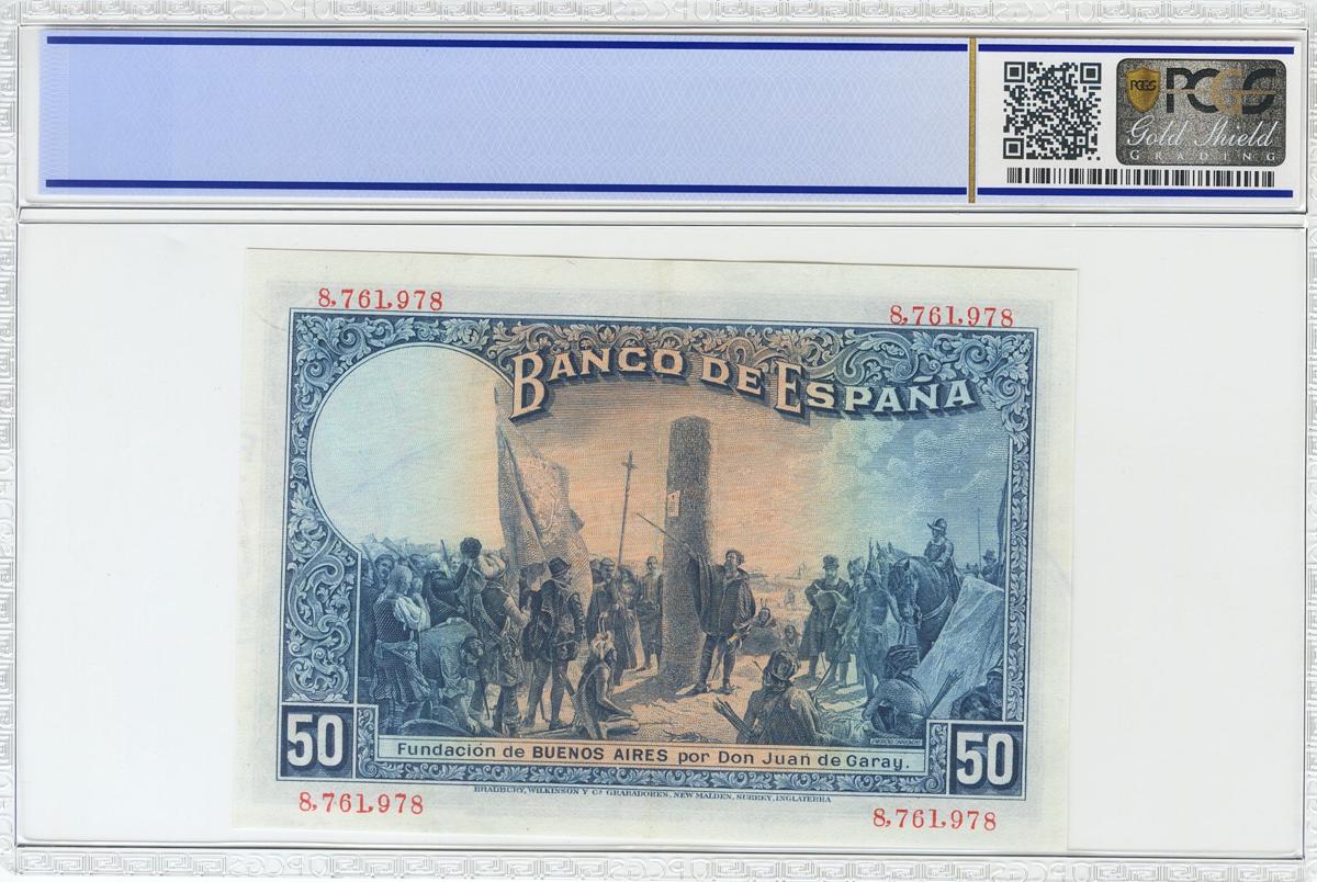 17 de Mayo de 1927. Sello de caucho REPUBLICA / ESPAÑOLA. Sin serie. (Edifil 2017: 332, Pick: 80b). Apresto original. Inusual en esta calidad. EBC+. (Encapsulado PCGS58OPQ, muy alta graduación para un billete que es muy difícil encontralo en calidades superiores)