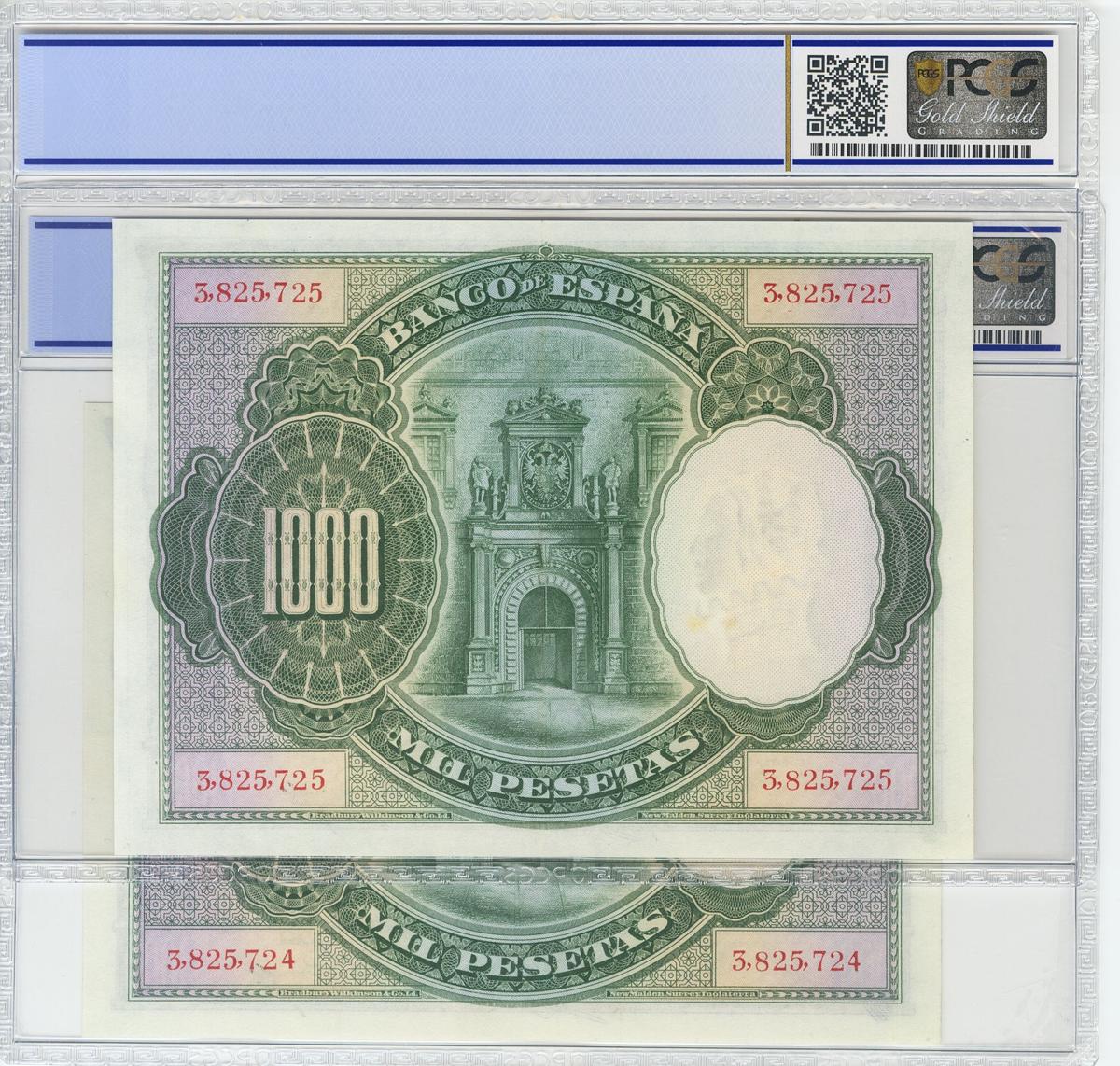 1000 Pesetas. 1 de Julio de 1925. Pareja correlativa. Sin serie. (Edifil 2017: 351 y Pick: 70c). Encapsulados ambos PCGS58. EBC+.