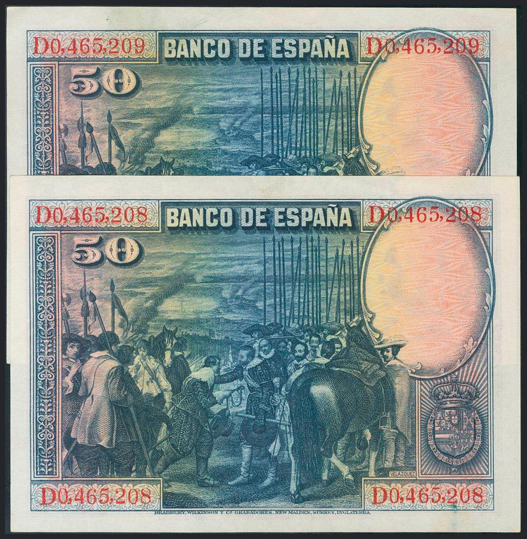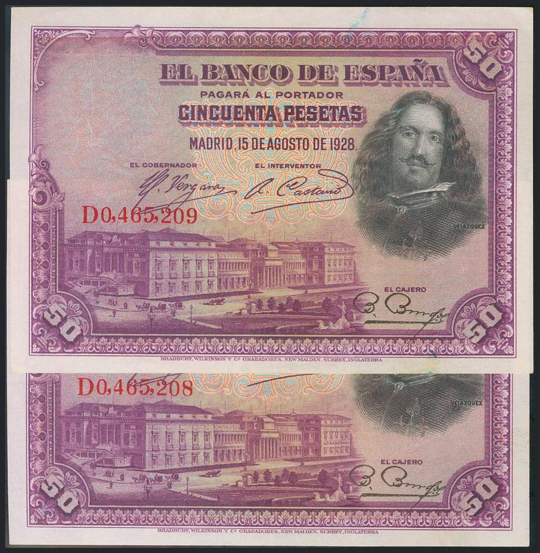 50 Pesetas. 15 de Agosto de 1928. Pareja correlativa. Serie D. (Edifil 2017: 354). EBC.