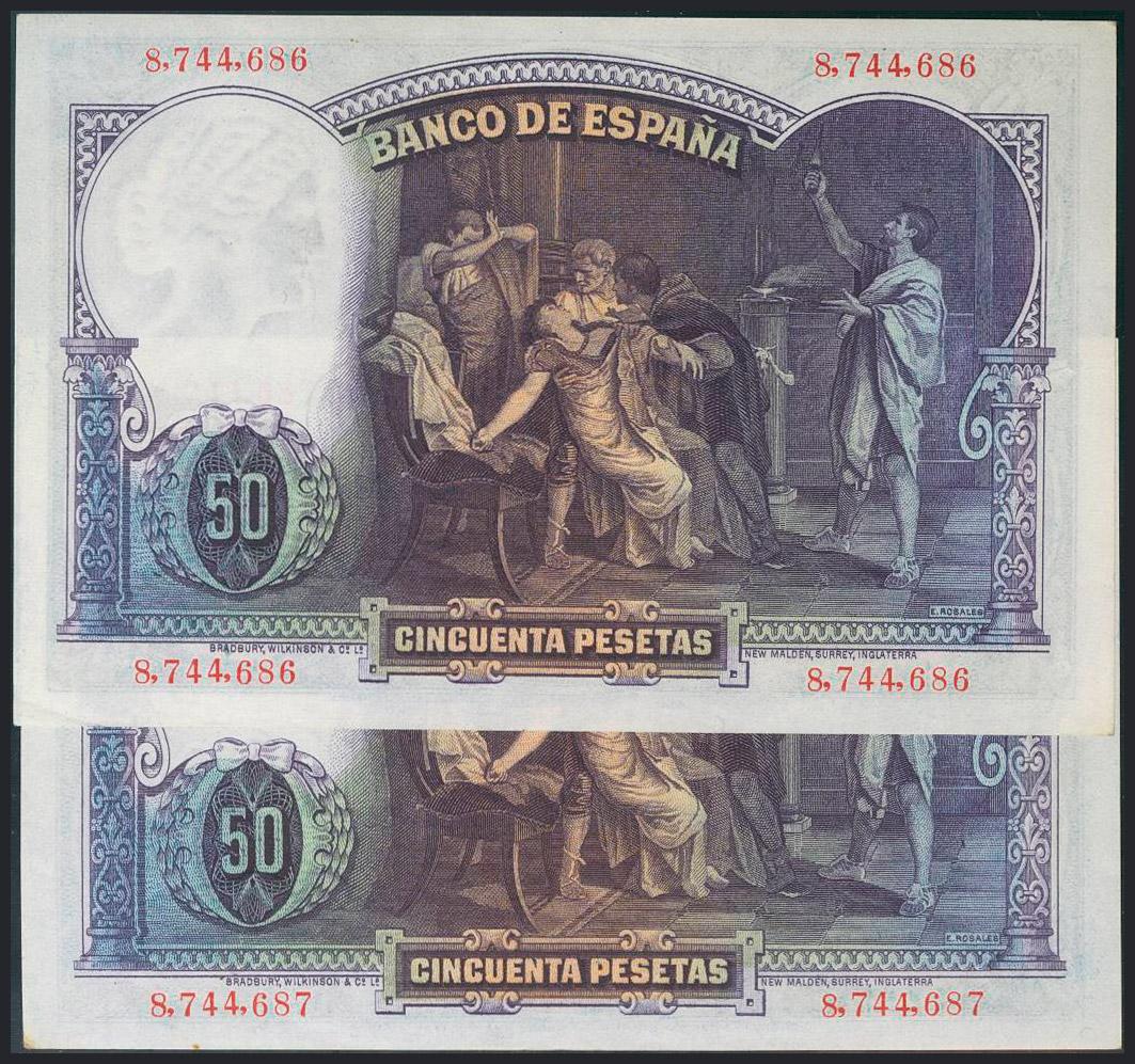 50 Pesetas. 25 de Abril de 1931. Pareja correlativa. Sin serie. (Edifil 2017: 359). Apresto original. EBC.