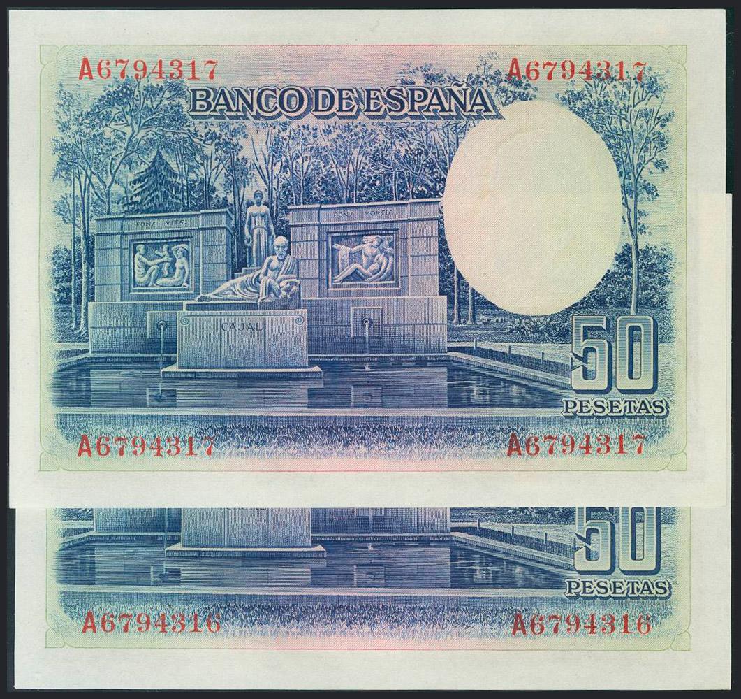 50 Pesetas. 22 de Julio de 1935. Pareja correlativa. Serie A. (Edifil 2017: 366a). Plancha y apresto original. Inusual. SC.