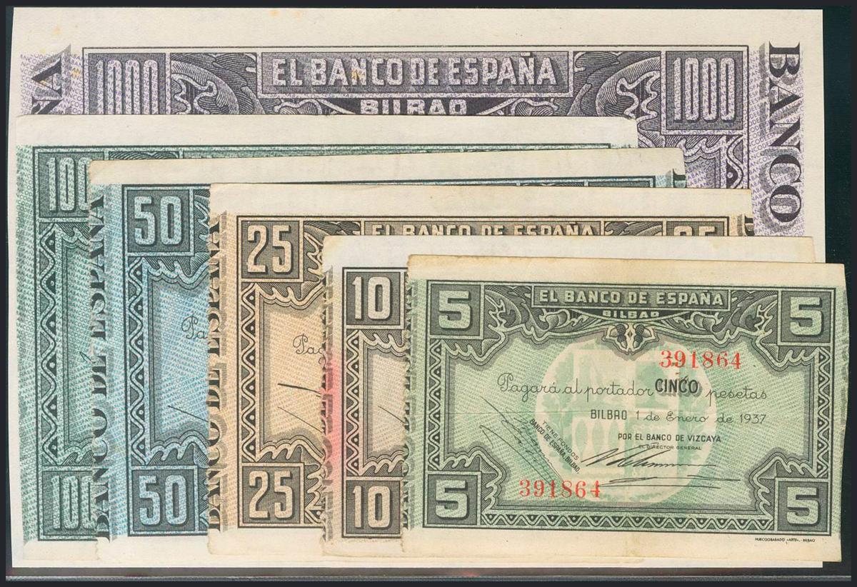 Conjunto de 6 billetes emitidos por el Banco de España, en Bilbao que incluye la serie completa excepto el 5 Pesetas de la serie A y el no emitido de 500 Pesetas. A EXAMINAR. 1 de Enero de 1937. (Edifil 2017: 385f, 387g, 388a, 389c, 390b, NE27f). BC.