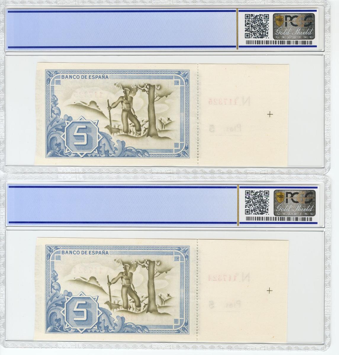 5 Pesetas. 1 de Enero de 1937. Pareja correlativa. Antefirma Banco Urquijo Vascongado y con matriz a izquierda. Sin serie. (Edifil 2017: 387f, Pick: s561). Apresto original. SC. Encapsulado PCGS66OPQ, para ambos billetes (altísima graduación).