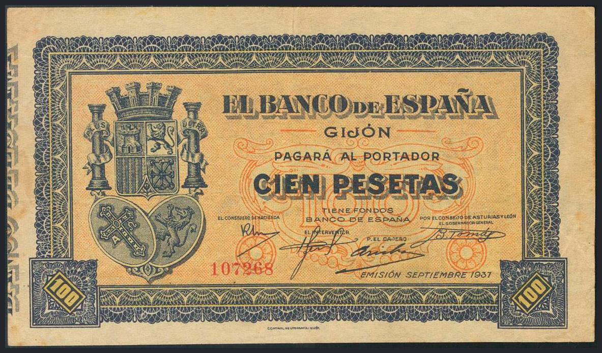 100 Pesetas. Septiembre de 1937. Banco de España, Gijón. Sin serie. (Edifil 2017: 399). BC.