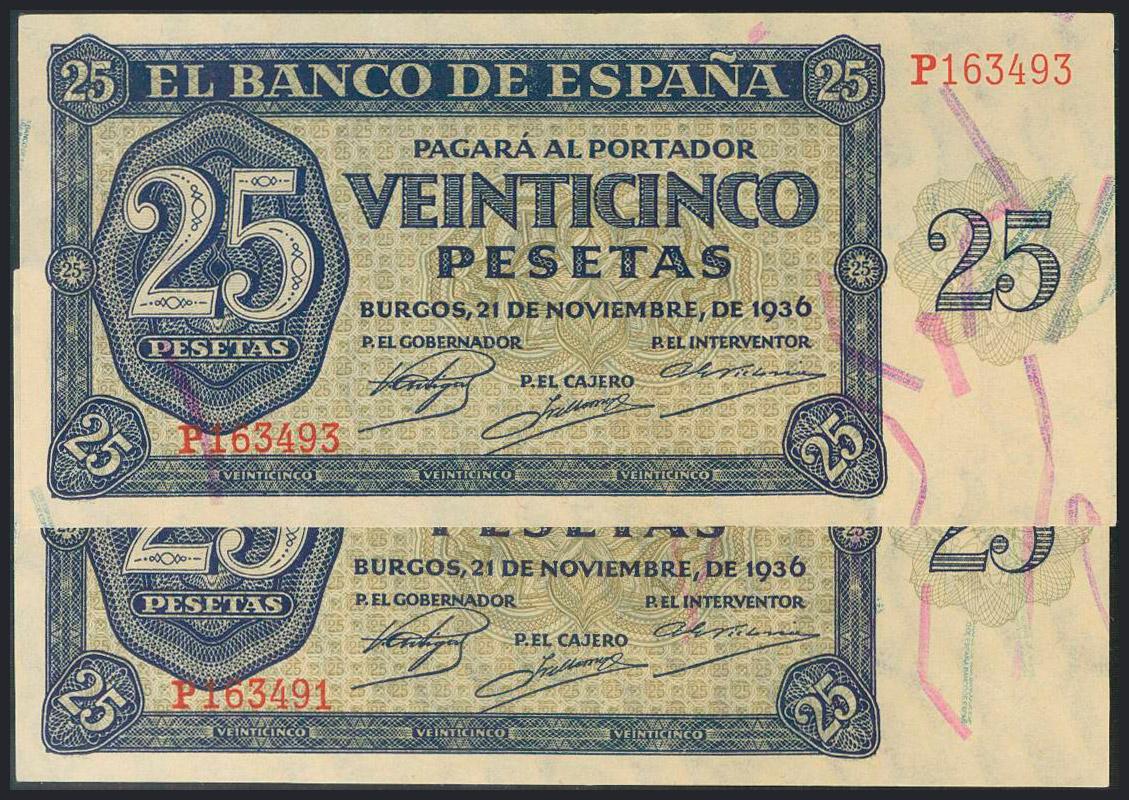 25 pesetas. 21 de Noviembre de 1936. Banco de España, Burgos. Serie P, pareja casi correlativa. (Edifil 2017: 419a). SC-/EBC+.