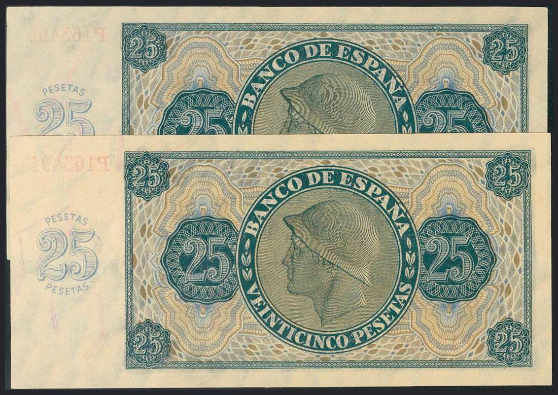 25 pesetas. 21 de Noviembre de 1936. Banco de España, Burgos. Serie P, pareja casi correlativa. (Edifil 2017: 419a). SC-/EBC+.
