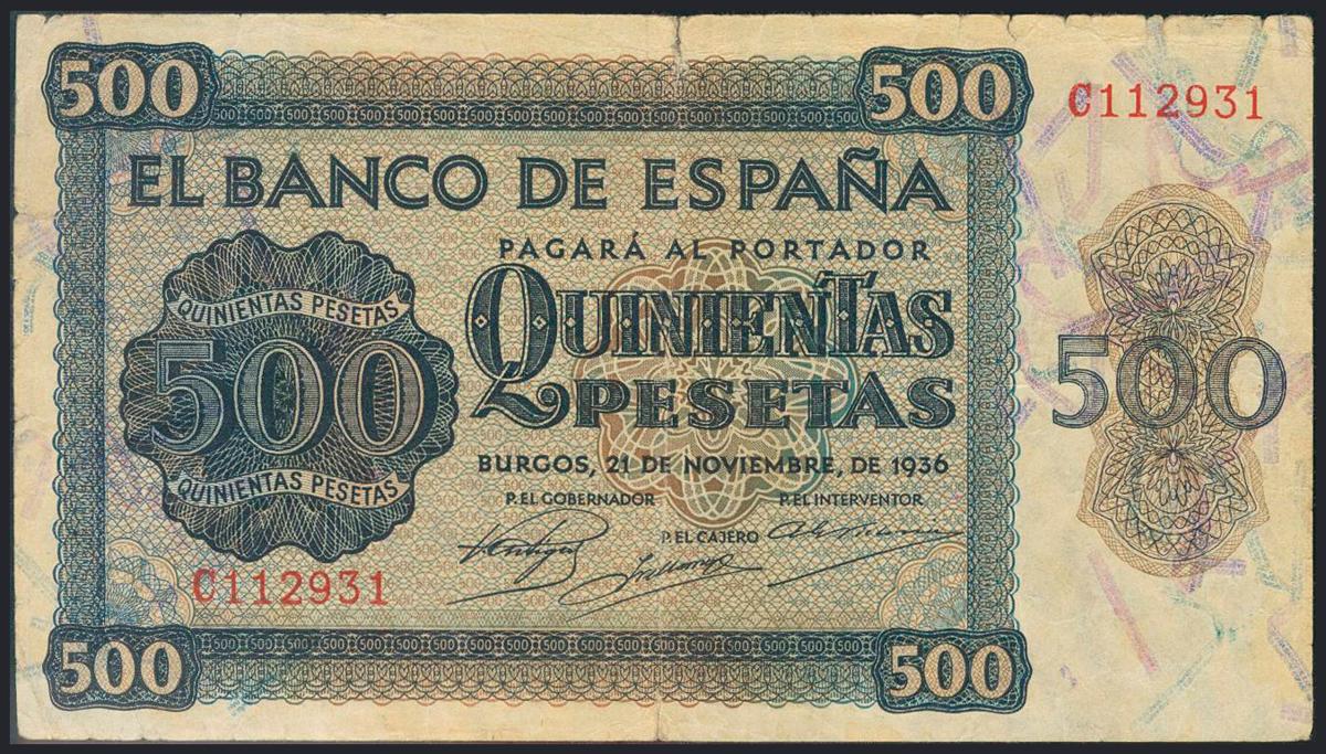 500 Pesetas. 21 de Noviembre de 1936. Serie C. (Edifil 2017: 422a). RC.
