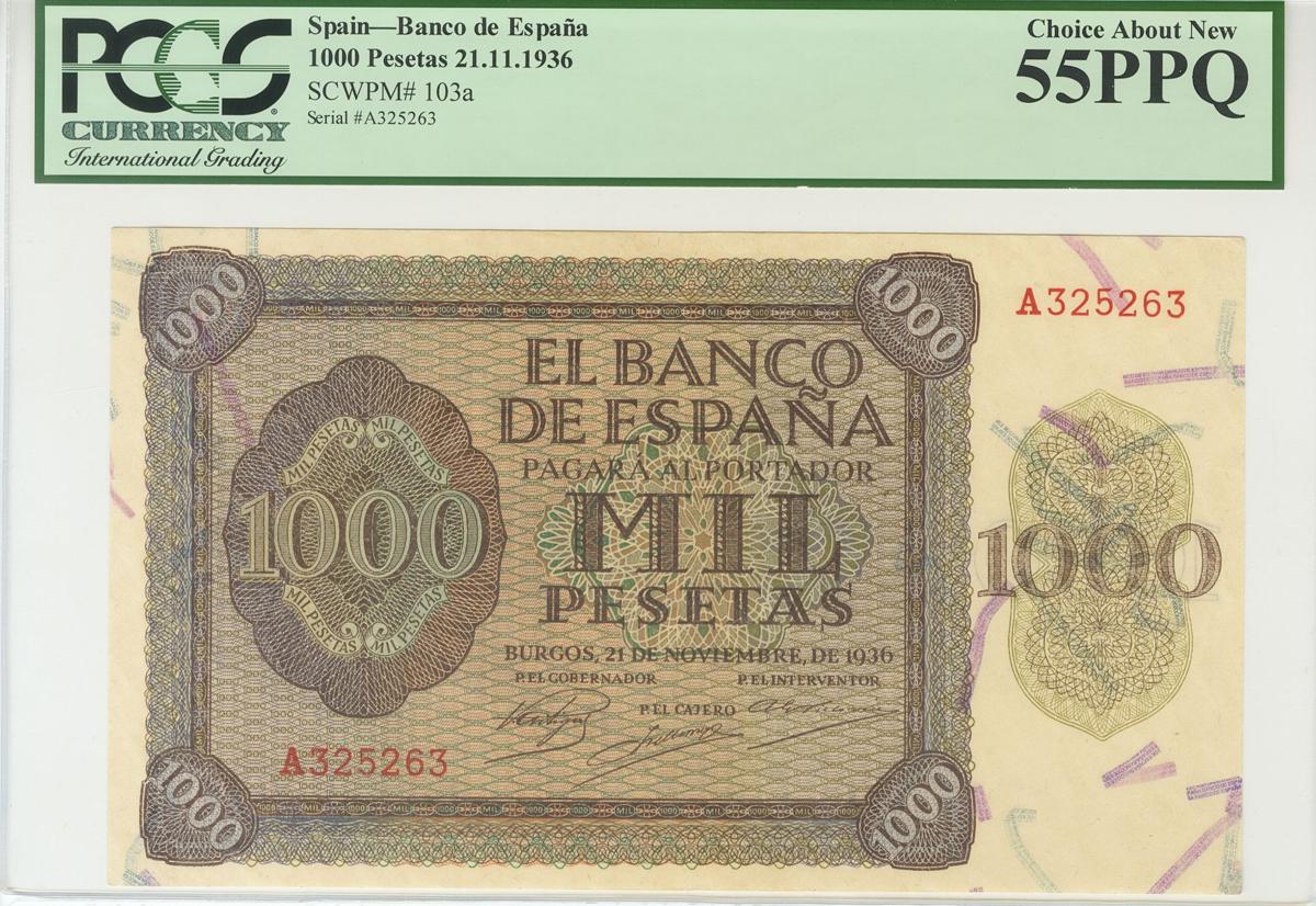 1000 Pesetas. 21 de Noviembre de 1936. Banco de España, Burgos. Serie A. (Edifil 2017: 423). Conserva gran parte del apresto original. Rarísimo así, en los registros públicos de PMG no más de tres billetes certificados en mejor calidad. Encapsulado PCGS 55PPQ. EBC+.