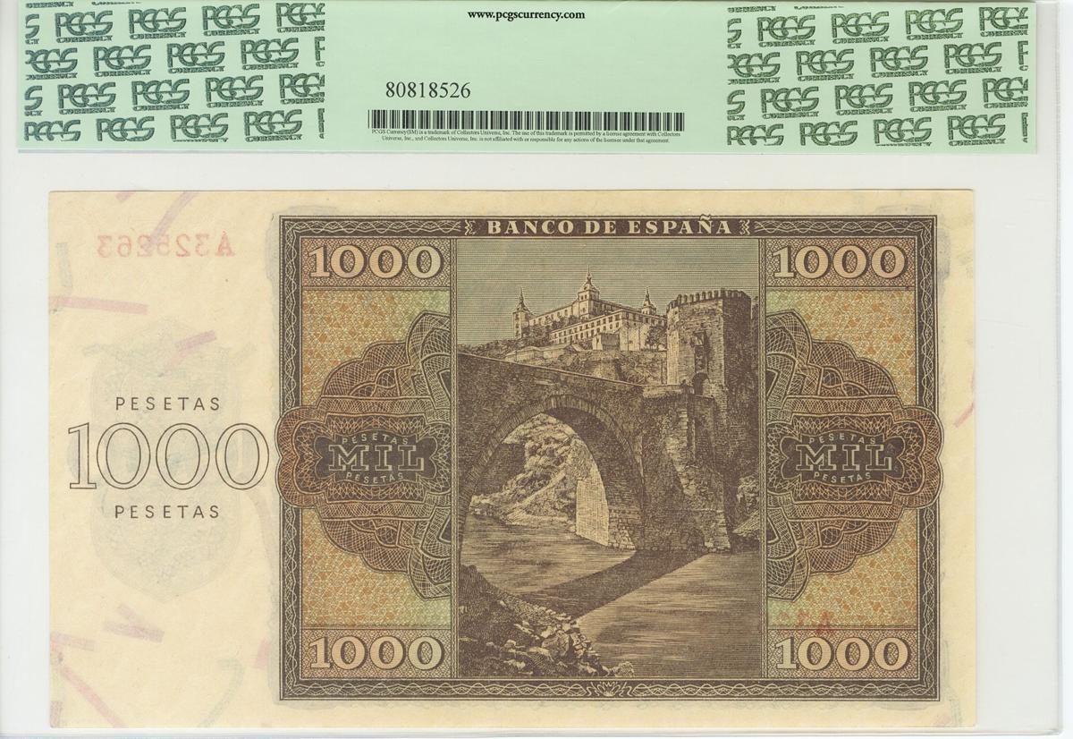 1000 Pesetas. 21 de Noviembre de 1936. Banco de España, Burgos. Serie A. (Edifil 2017: 423). Conserva gran parte del apresto original. Rarísimo así, en los registros públicos de PMG no más de tres billetes certificados en mejor calidad. Encapsulado PCGS 55PPQ. EBC+.