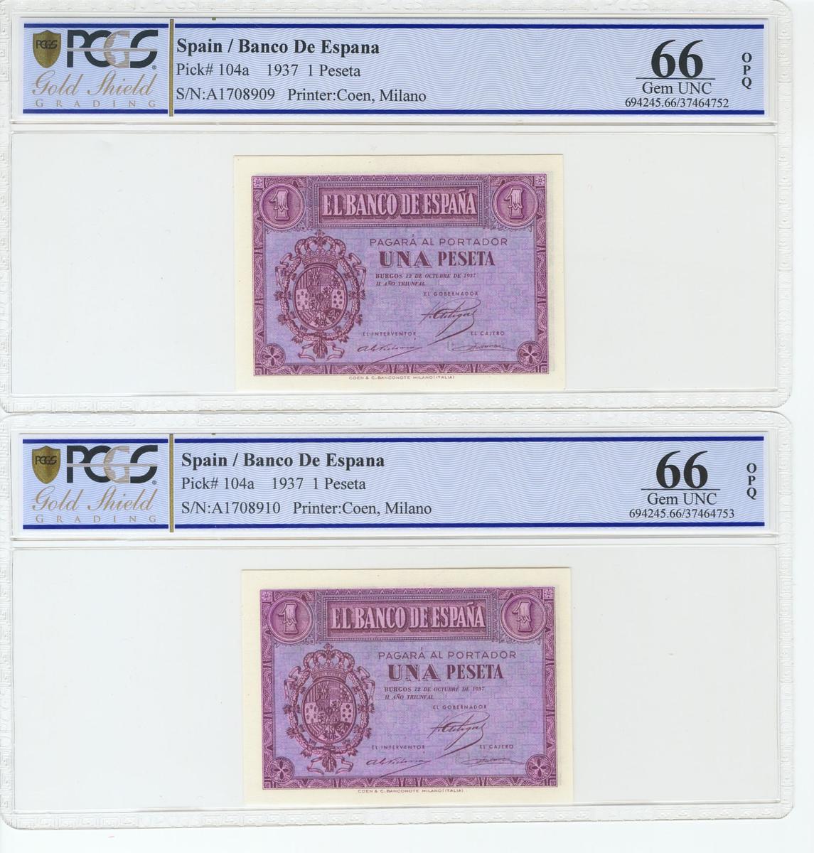 1 Peseta. 12 de Octubre de 1937. Pareja correlativa. Serie A. (Edifil 2017: 425a, Pick: 104a). Apresto original. Inusual así. SC. Encapsulado PCGS66OPQ, para ambos billetes (altísima graduación para una pareja, probablemente la mayor conocida).