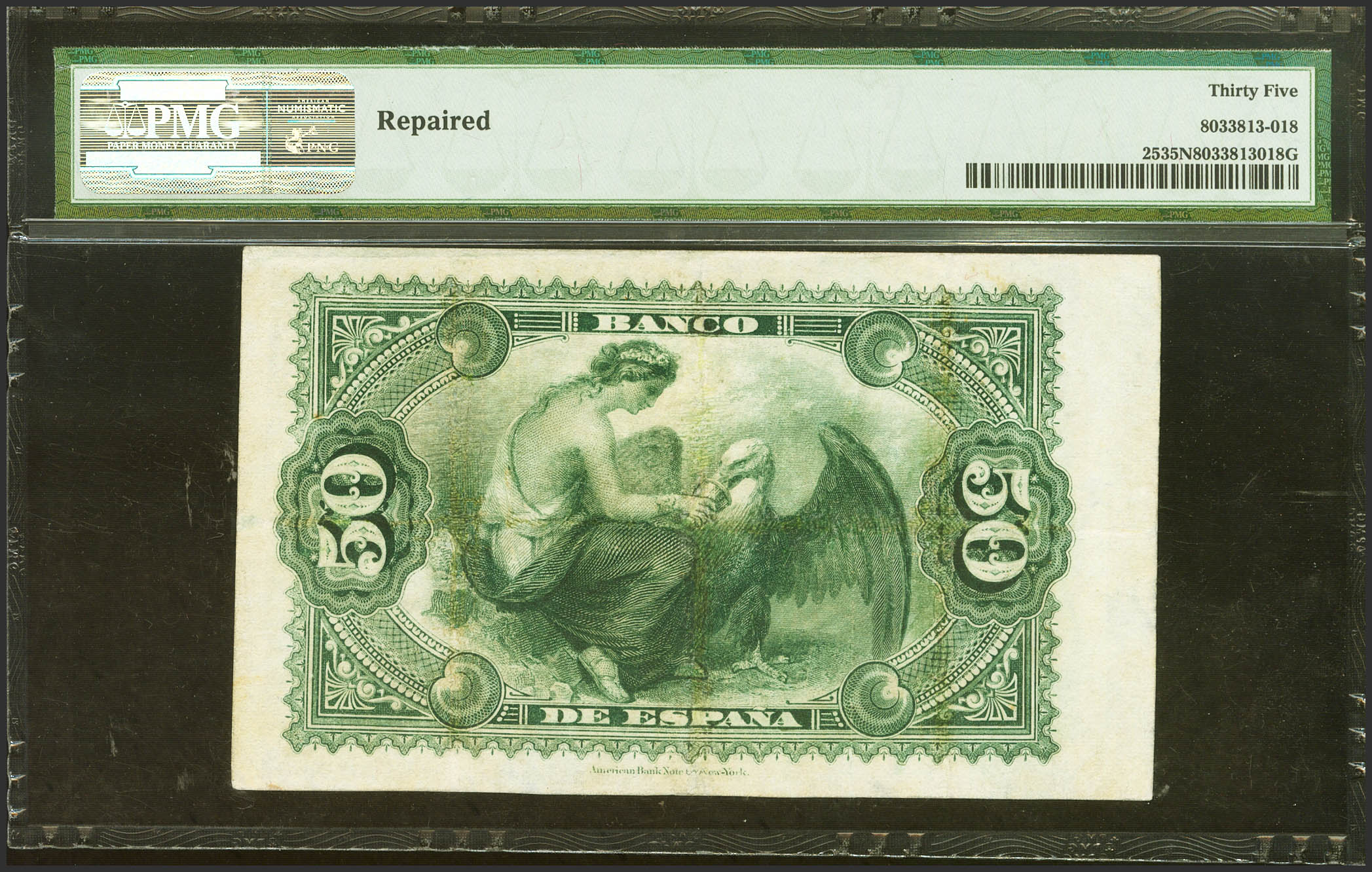 50 Pesetas. 1 de Enero de 1884. Sin serie. (Edifil 2023: 283, Pick: 25). Raro, reparado. MBC+. Encapsulado PMG35NET.