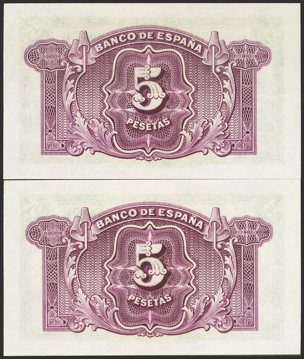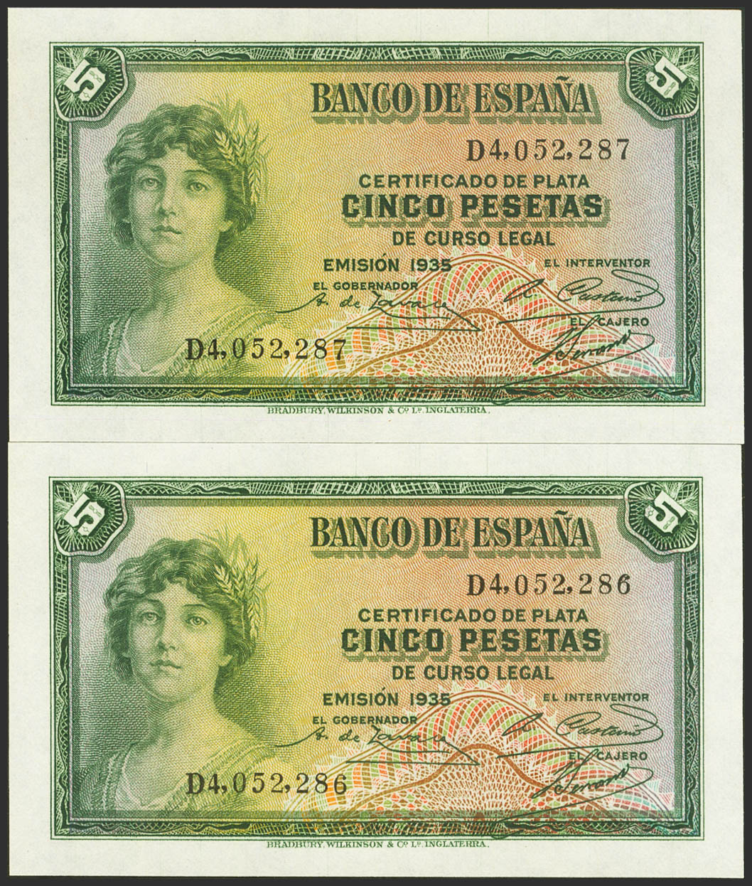 5 Pesetas. 1935. Pareja correlativa. Certificado de Plata. Serie D. (Edifil 2023: 363a). Conserva todo su apresto original. SC.