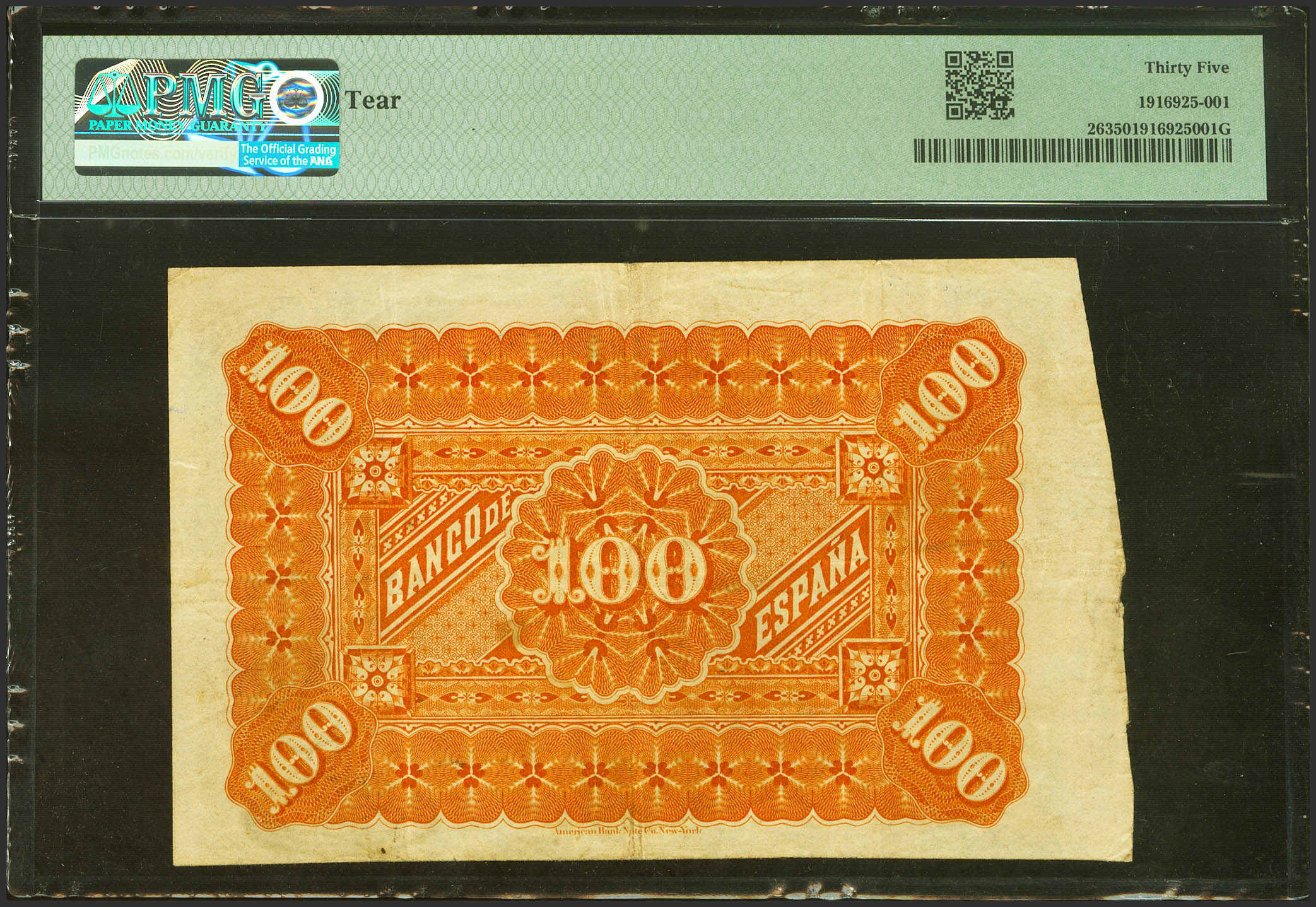100 Pesetas. 1 de Enero de 1884. Sin serie. (Edifil 2023: 284, Pick: 26). Muy raro, especialmente sin reparaciones y en esta calidad. MBC+. Encapsulado PMG35 (tear).