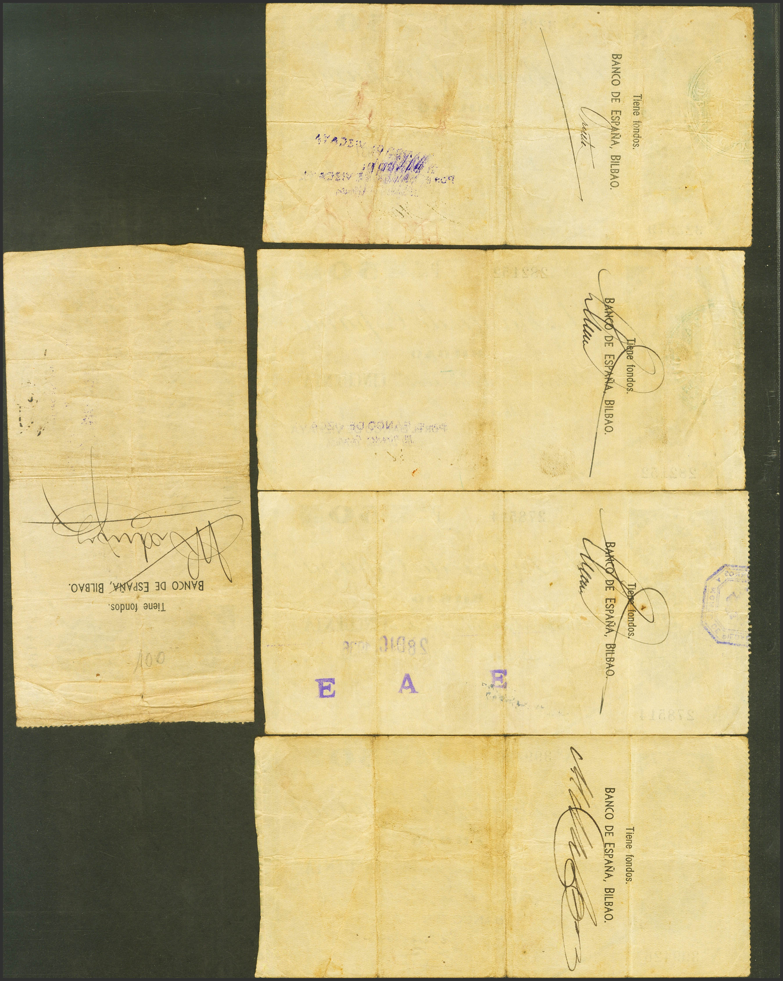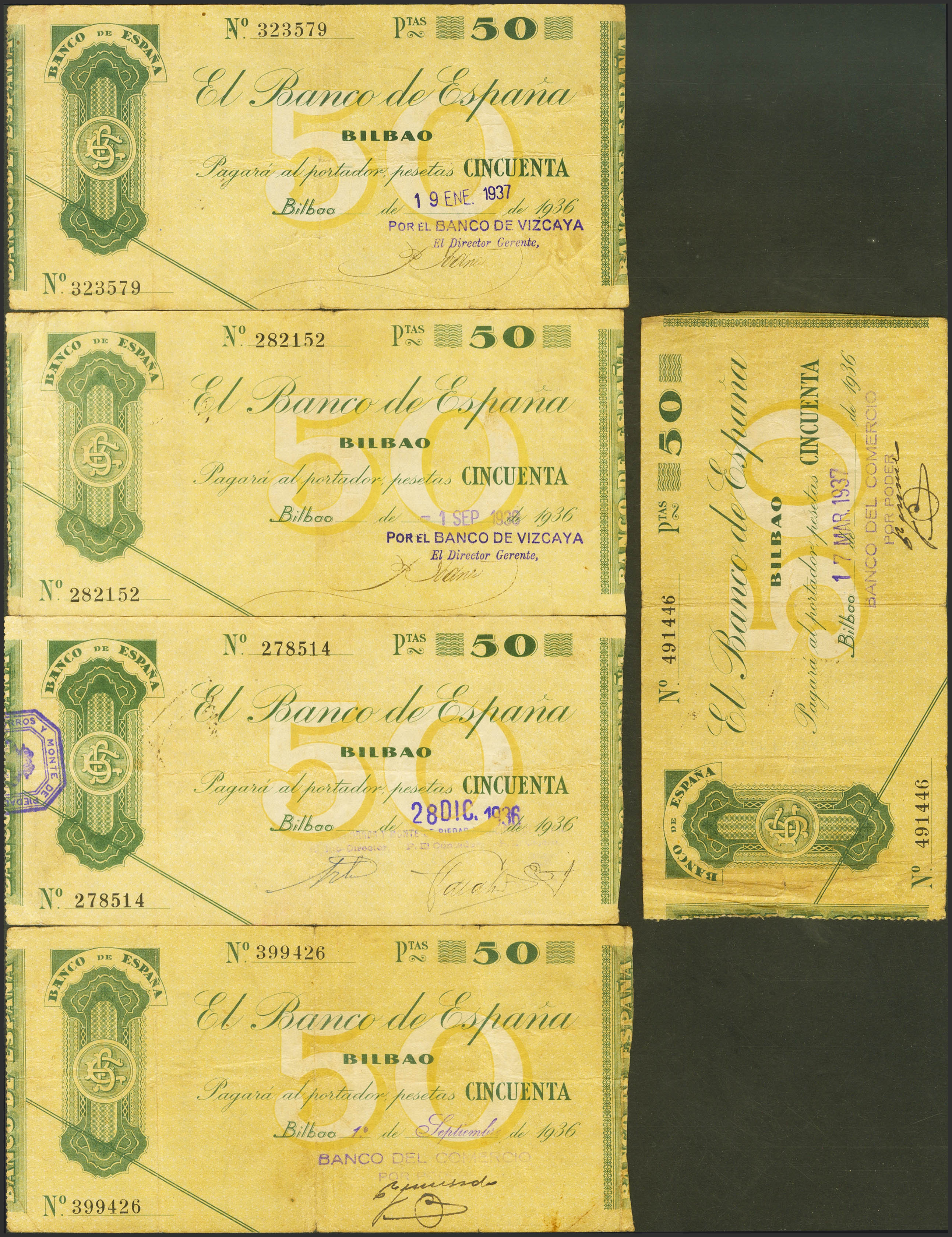 Conjunto de 5 billetes de 50 Pesetas del Banco de Bilbao, emitidos en 1936, todos ellos sin serie y con diversas antefirmas. (Edifil 2023: 370). MBC.