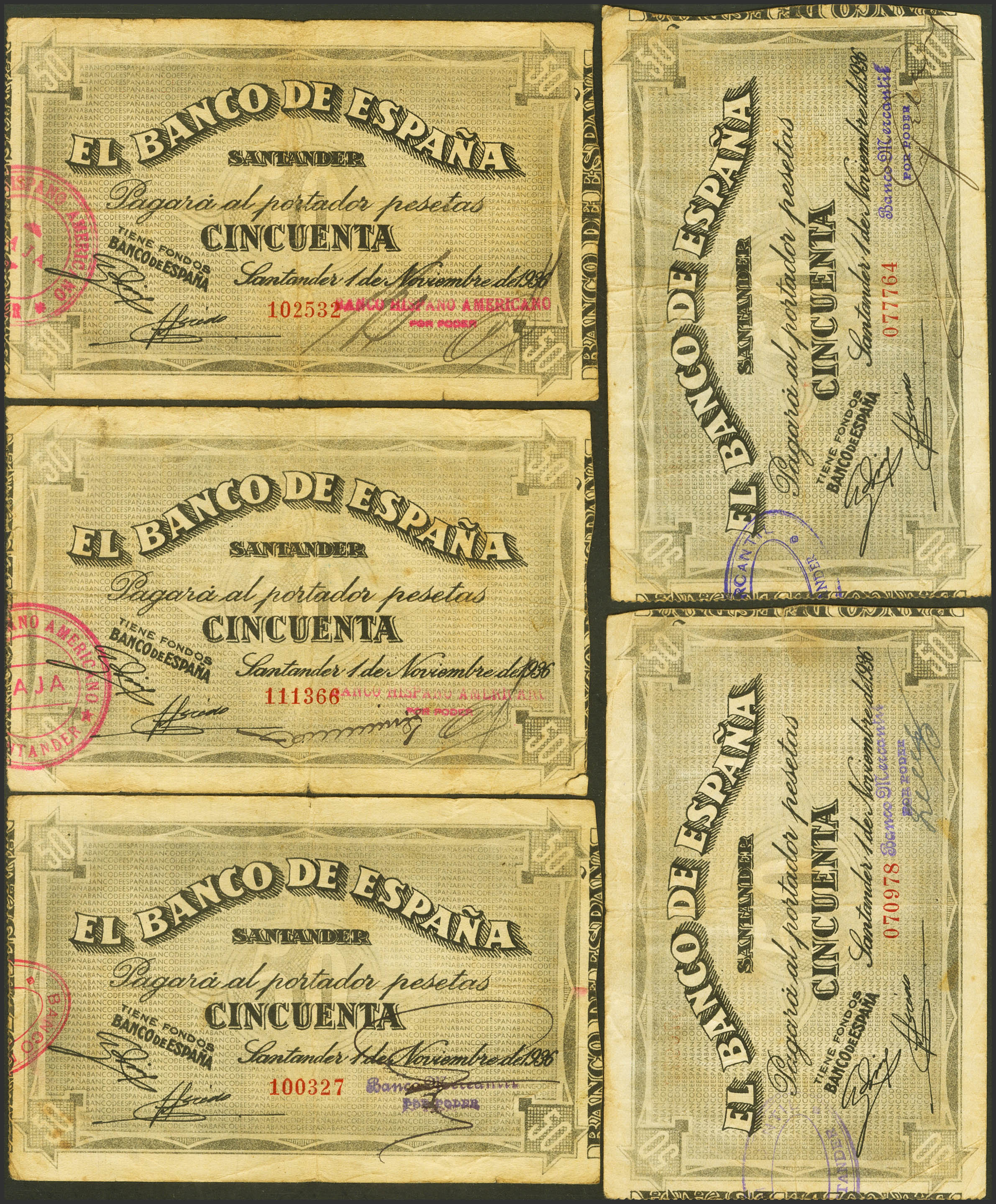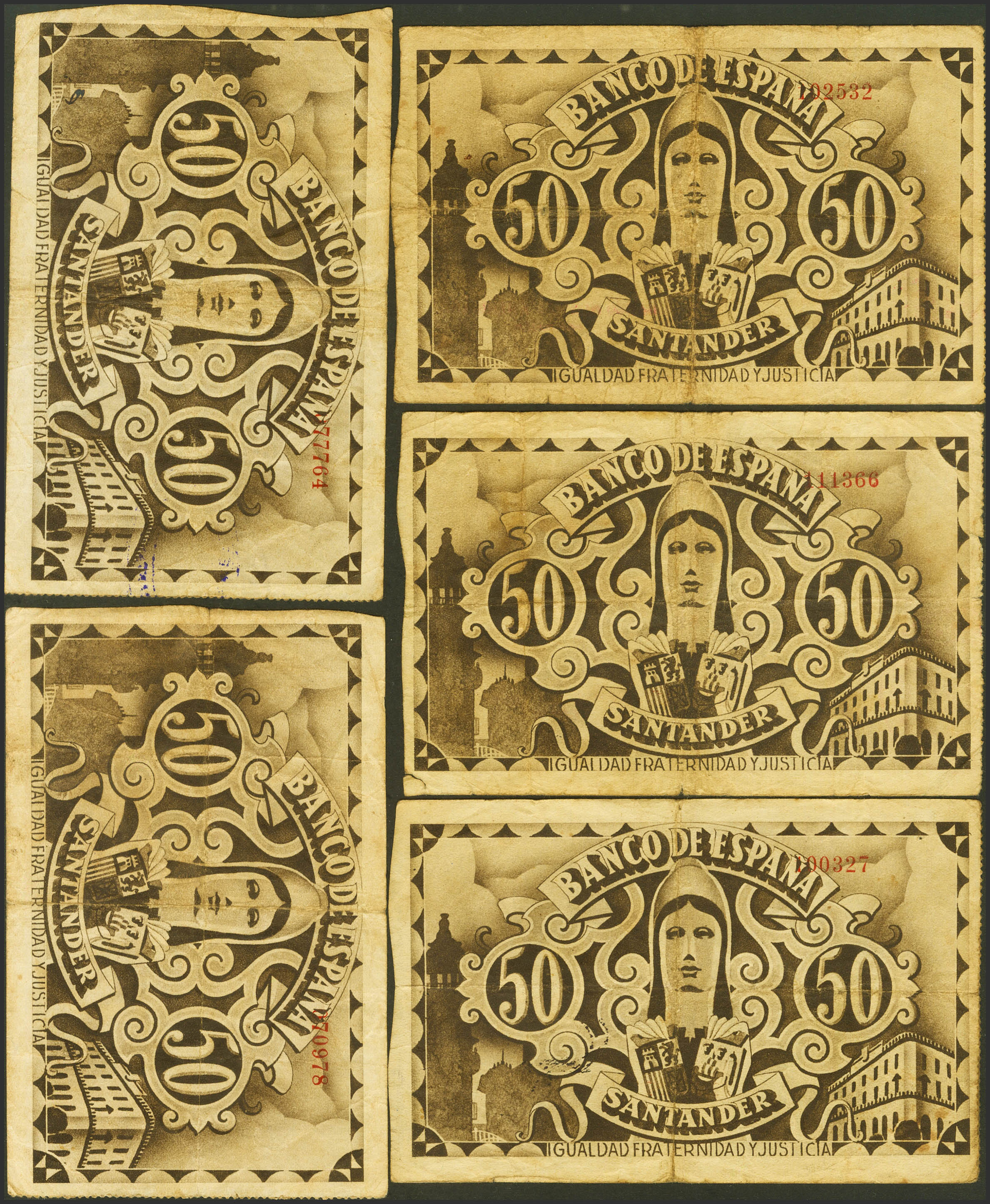 Conjunto de 5 billetes de 50 Pesetas del Banco de Santander, emitidos el 1 de Noviembre de 1936, todos ellos sin serie y con diversas antefirmas. (Edifil 2023: 378). MBC.