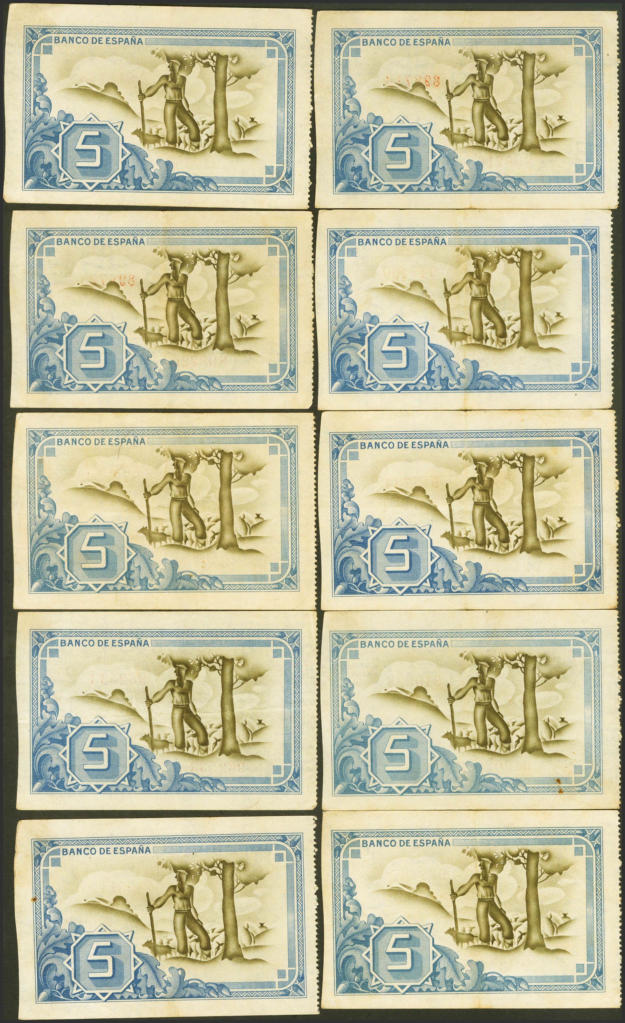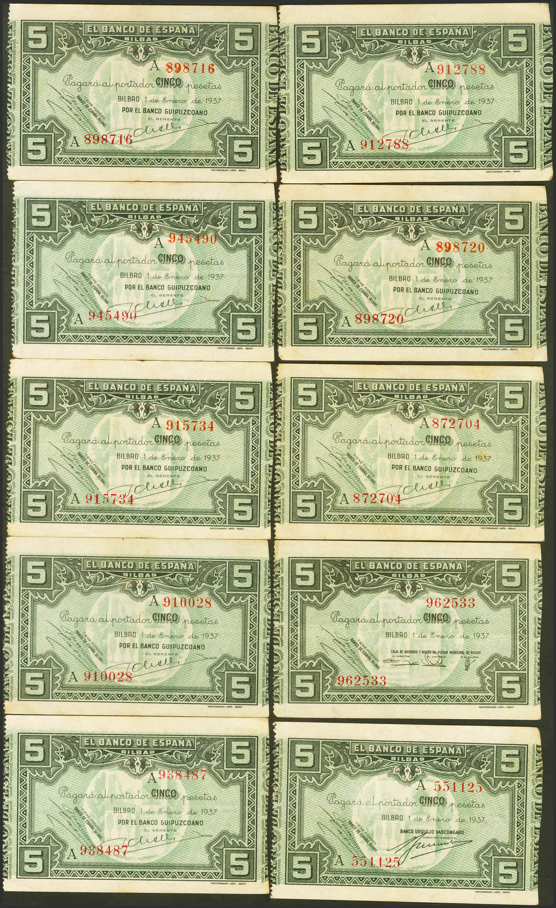 Conjunto de 10 billetes de 5 Pesetas del Banco de Bilbao, emitidos el 1 de Enero de 1937, todos ellos sin serie y con diversas antefirmas. (Edifil 2023: 385). EBC/MBC+.