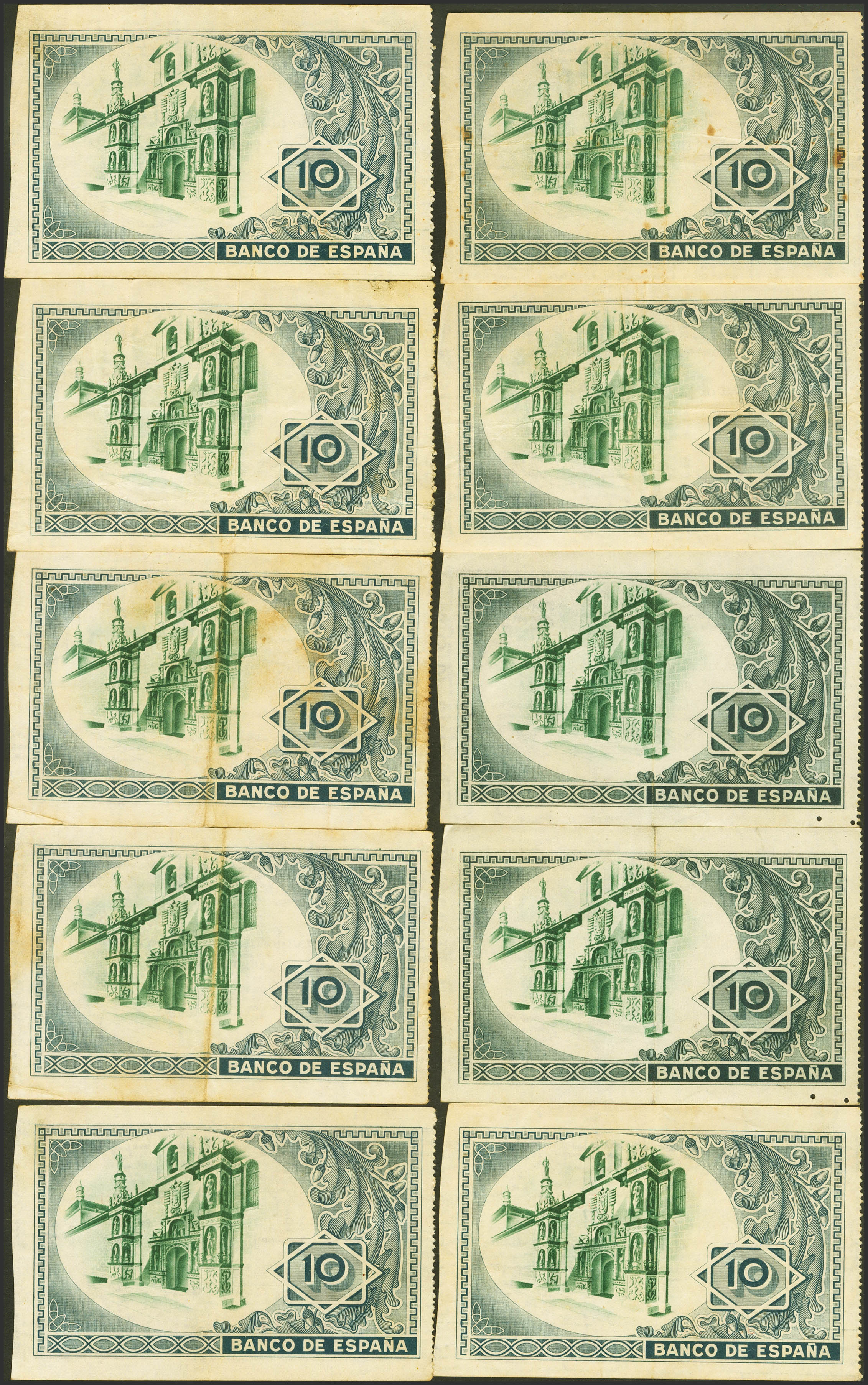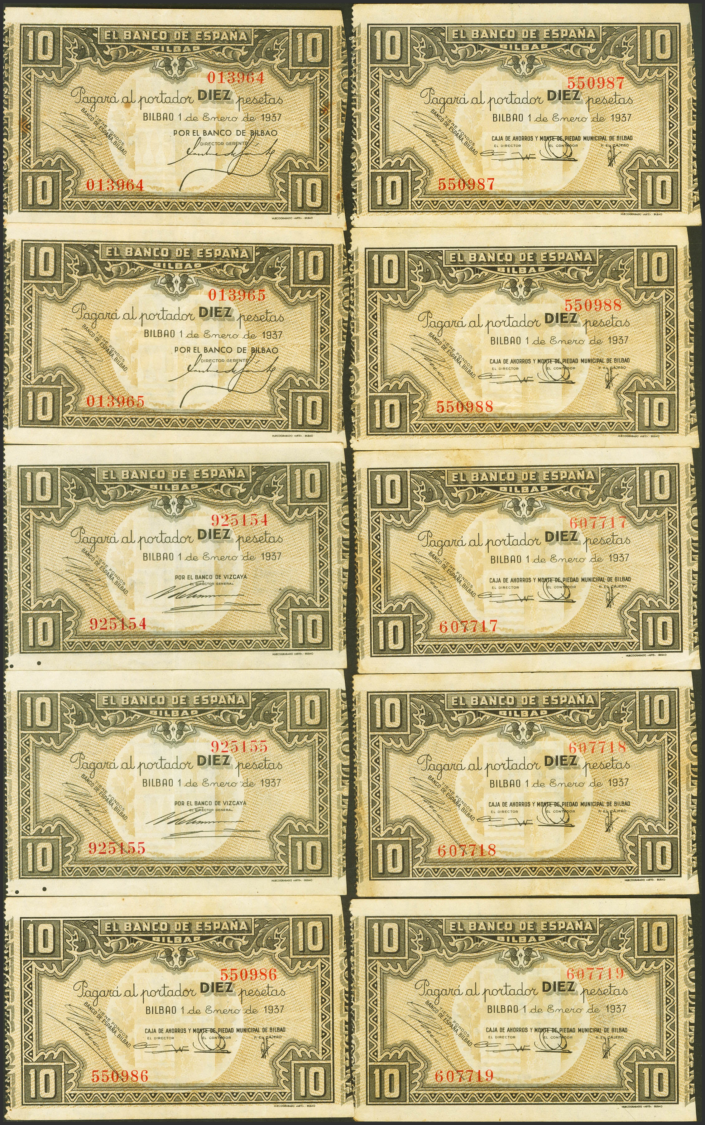 Conjunto de 10 billetes de 10 Pesetas del Banco de Bilbao, emitidos el 1 de Enero de 1937, todos ellos sin serie y con diversas antefirmas. (Edifil 2023: 387). EBC/EBC-.