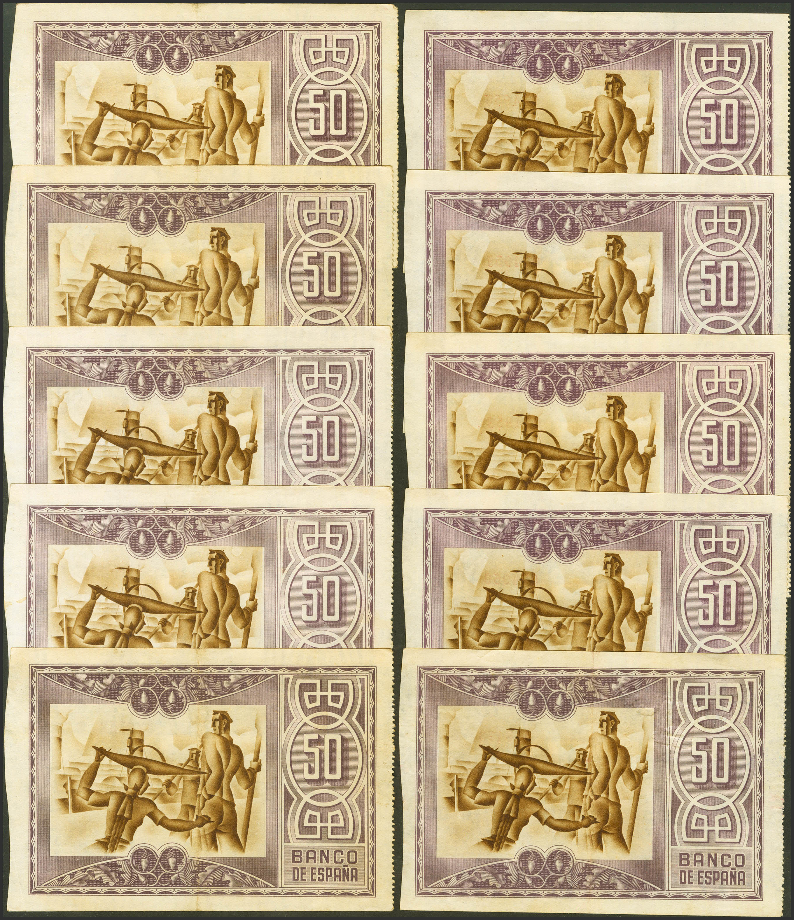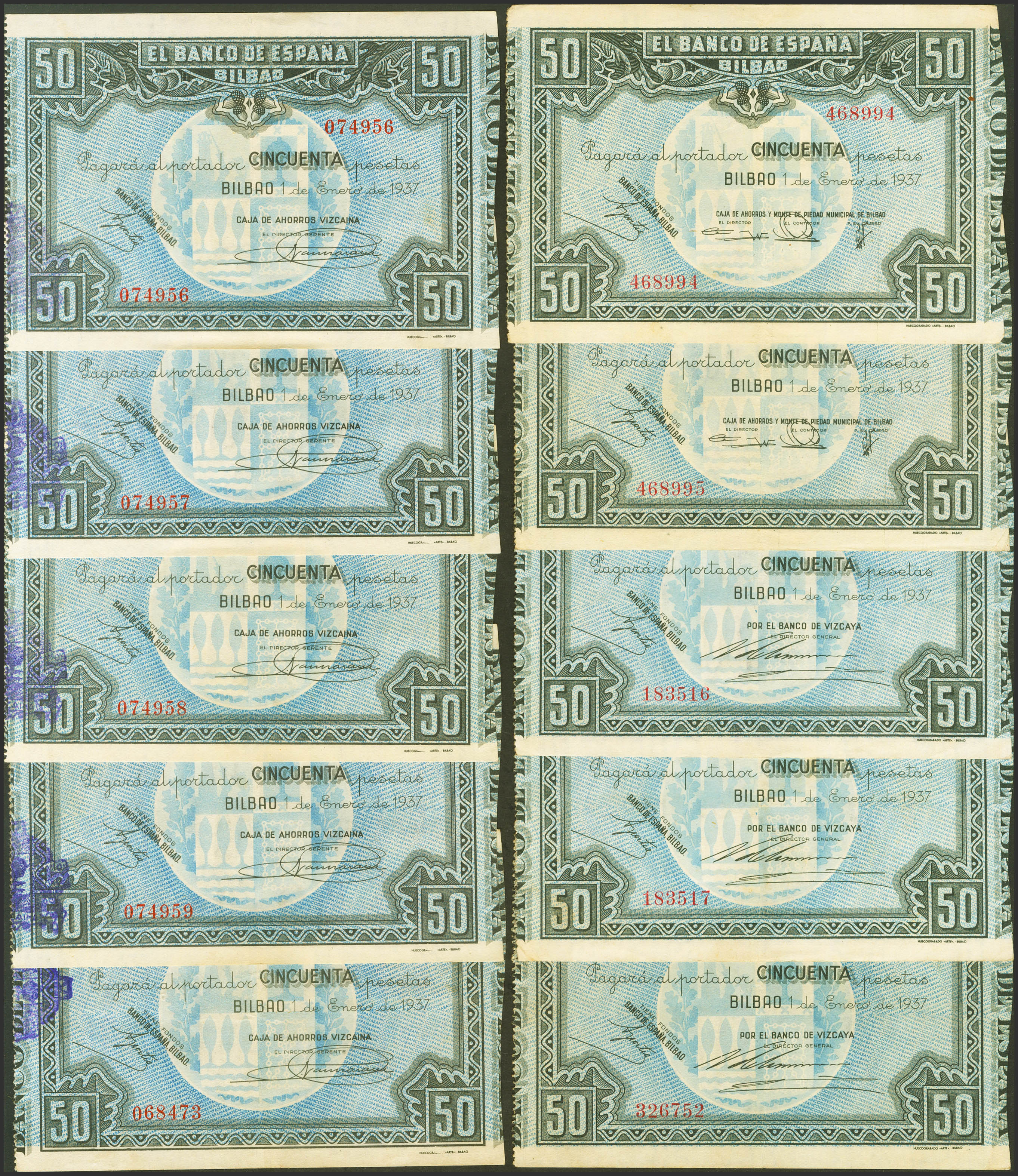 Conjunto de 10 billetes de 50 Pesetas del Banco de Bilbao, emitidos el 1 de Enero de 1937, todos ellos sin serie y con diversas antefirmas. (Edifil 2023: 389). EBC/EBC-.