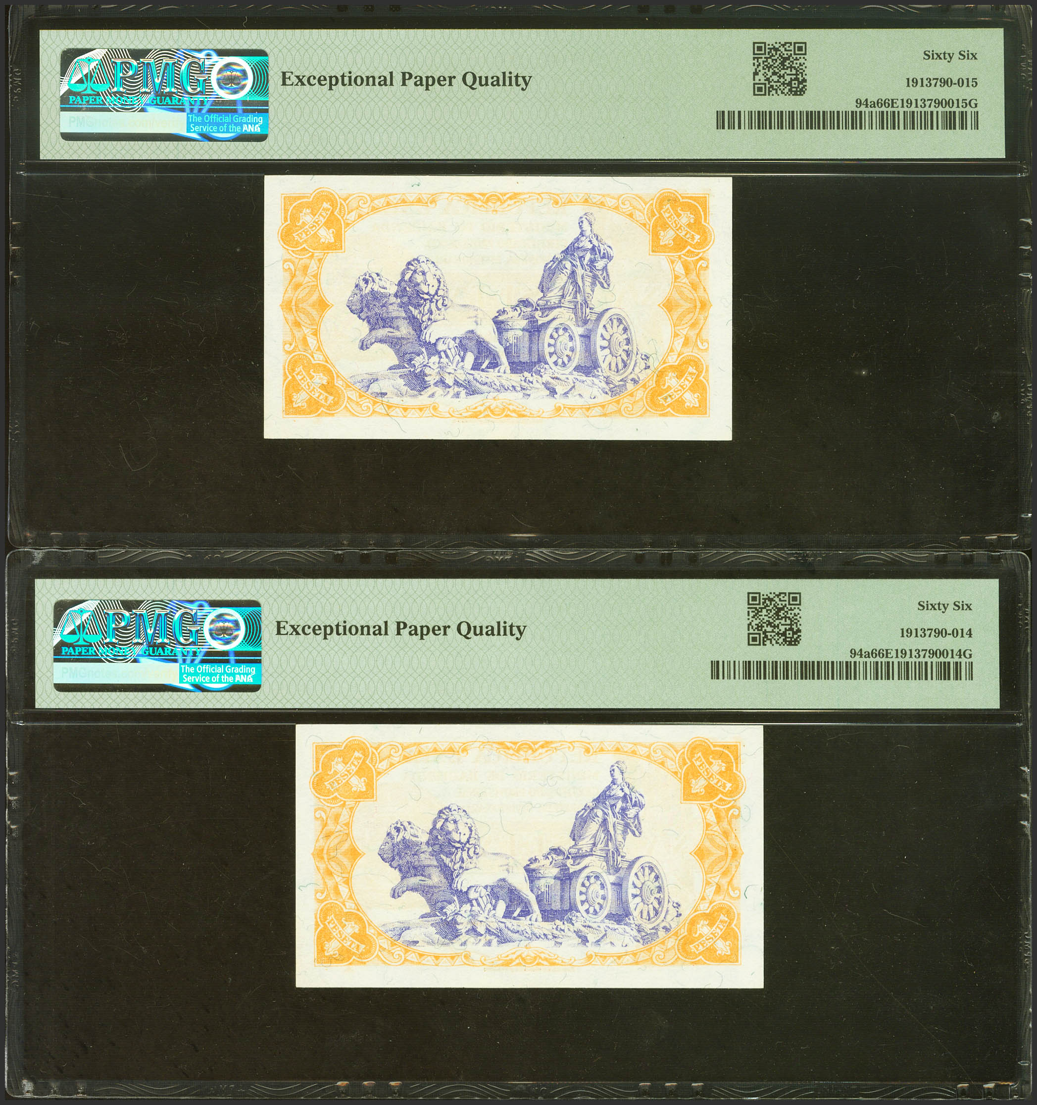 1 Peseta. 1937. Ministerio de Hacienda. Pareja correlativa. Serie B. (Edifil 2023: 392, Pick: 94). Apresto original. SC. Encapsulados PMG66EPQ, ambos.
