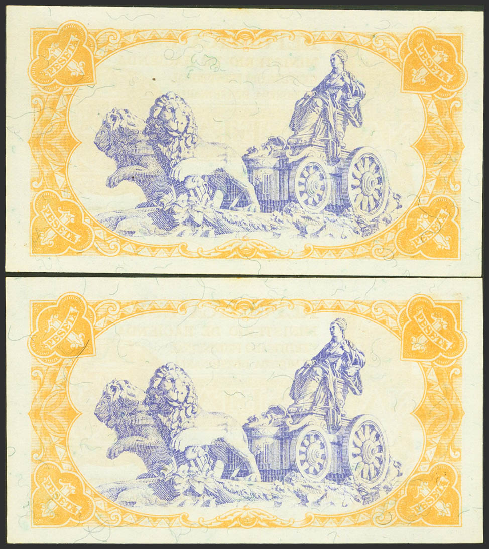 1 Peseta. 1937. Ministerio de Hacienda. Pareja correlativa. Serie B. (Edifil 2021: 392). Apresto original, típicos puntitos. SC.