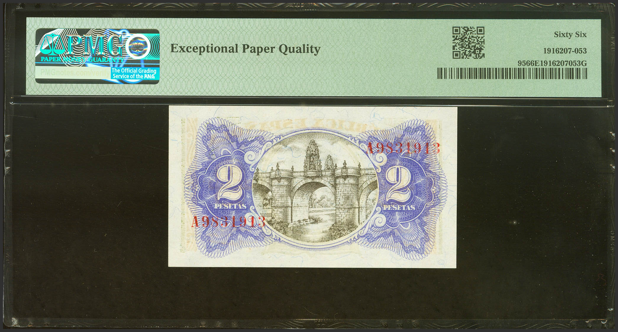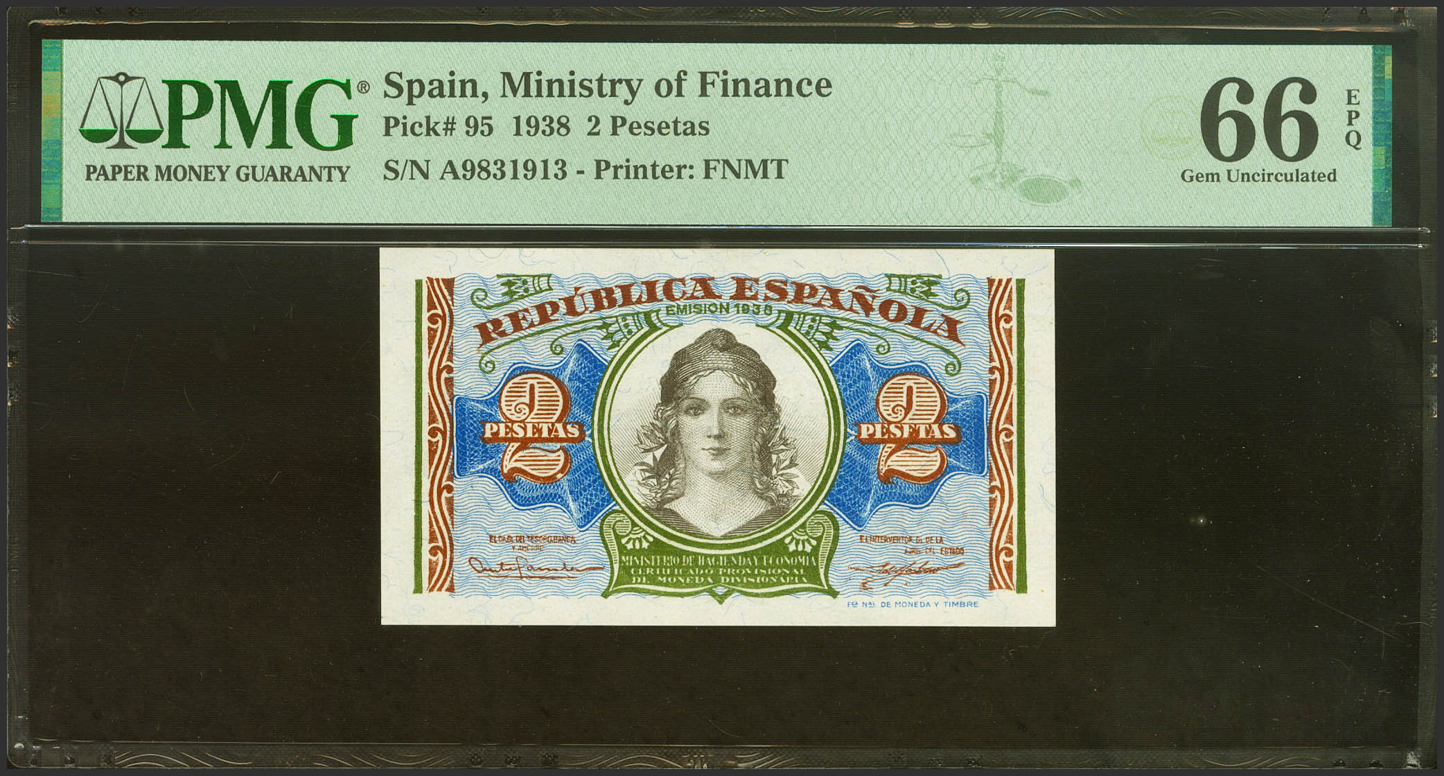 2 Pesetas. 1938. Ministerio de Hacienda. Serie A. (Edifil 2021: 393, Pick: 95). Apresto original. SC. Encapsulado PMG66EPQ.