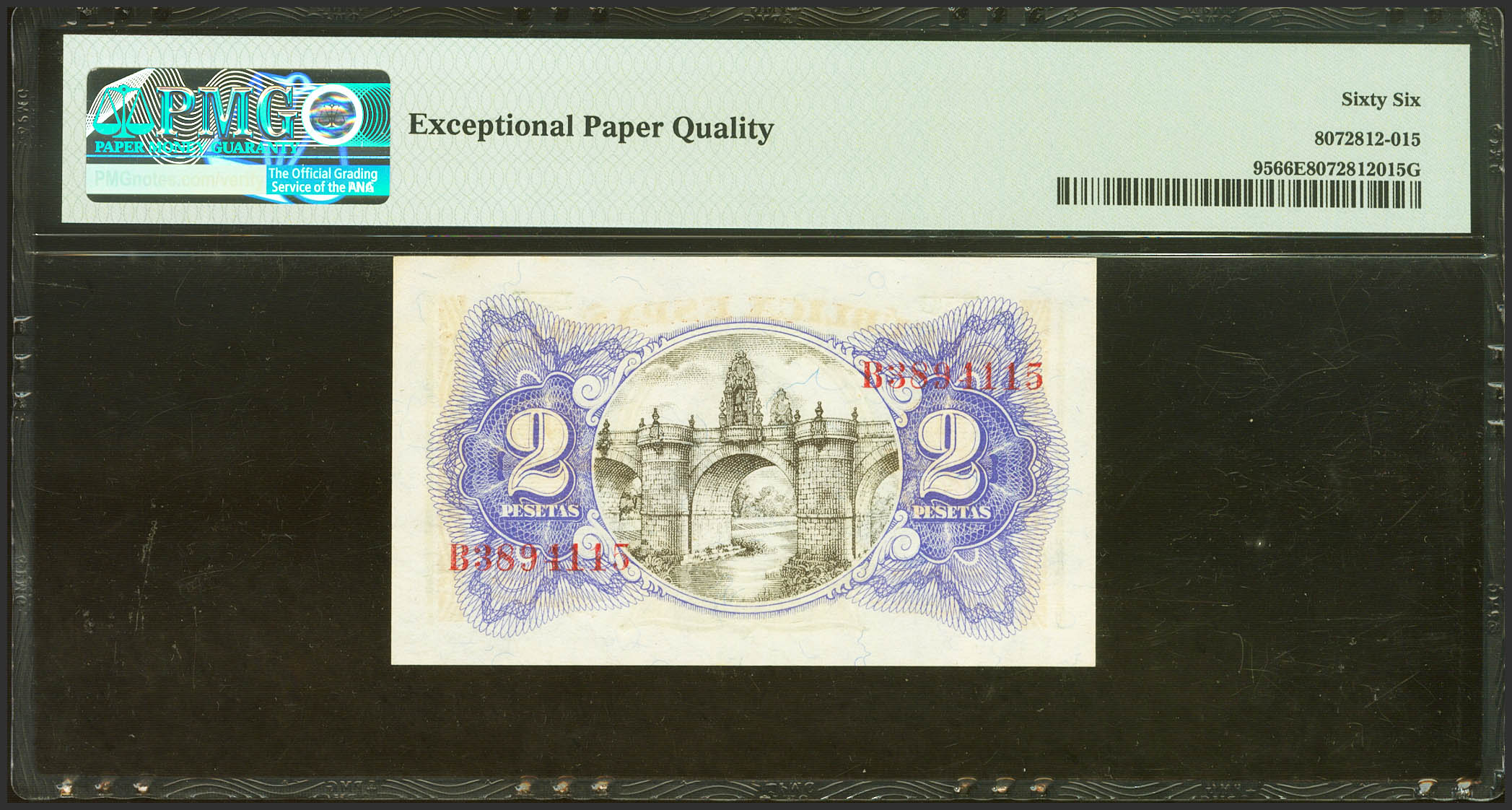 2 Pesetas. 1938. Ministerio de Hacienda. Serie B. (Edifil 2023: 393, Pick: 95). Apresto original. SC. Encapsulado PMG66EPQ.